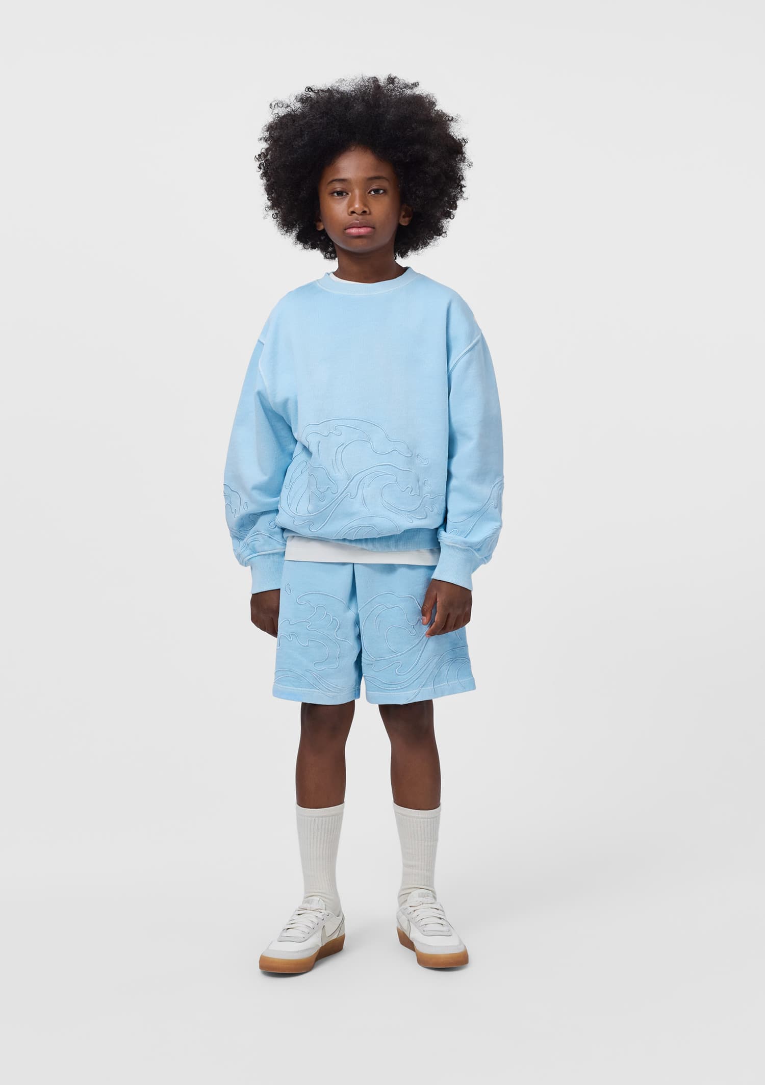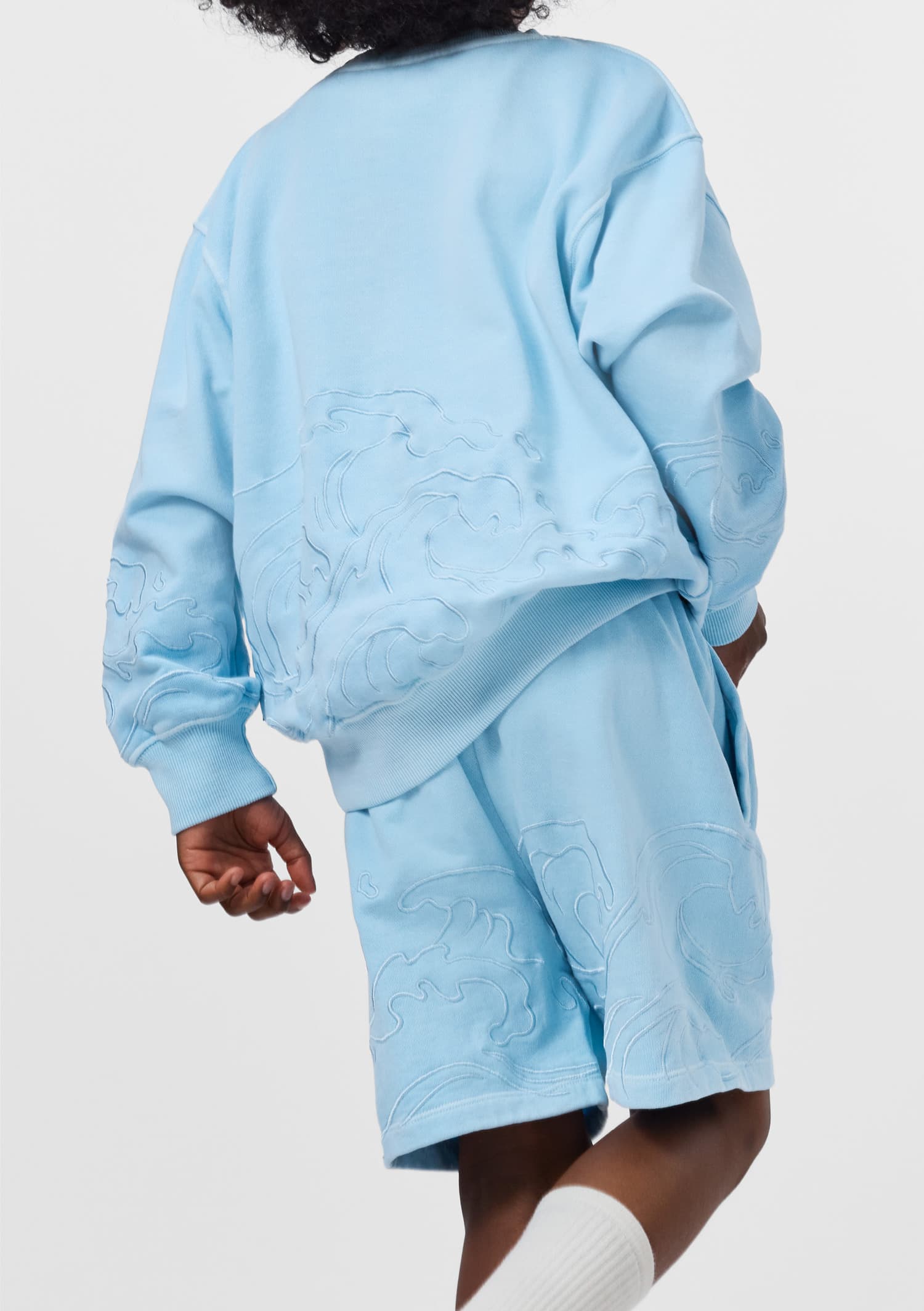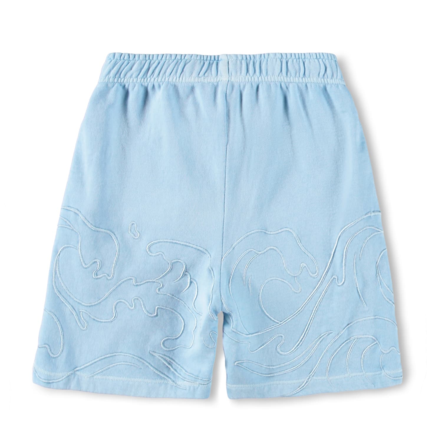 Sorti bleu produsi din tricotaj din bumbac moale, organic cu broderie de valuri in acelasi ton. Modelul are elastic in talie cu sireturi , buzunare in parti si