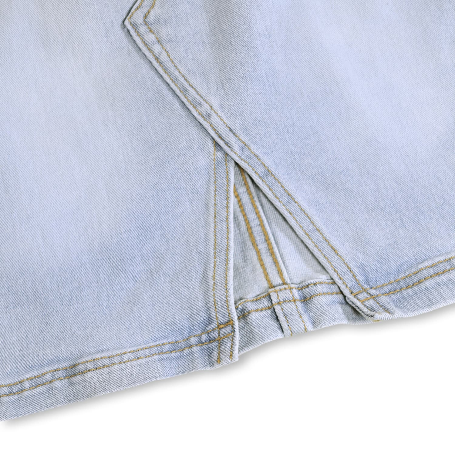 Fusta albastra din denim produsa din bumbac organic cu un slit deschis in fata. Fusta este un model clasic in forma de A, buzunare in fata si spate, capse metalice pina la marimea 140 si elastic in talie.