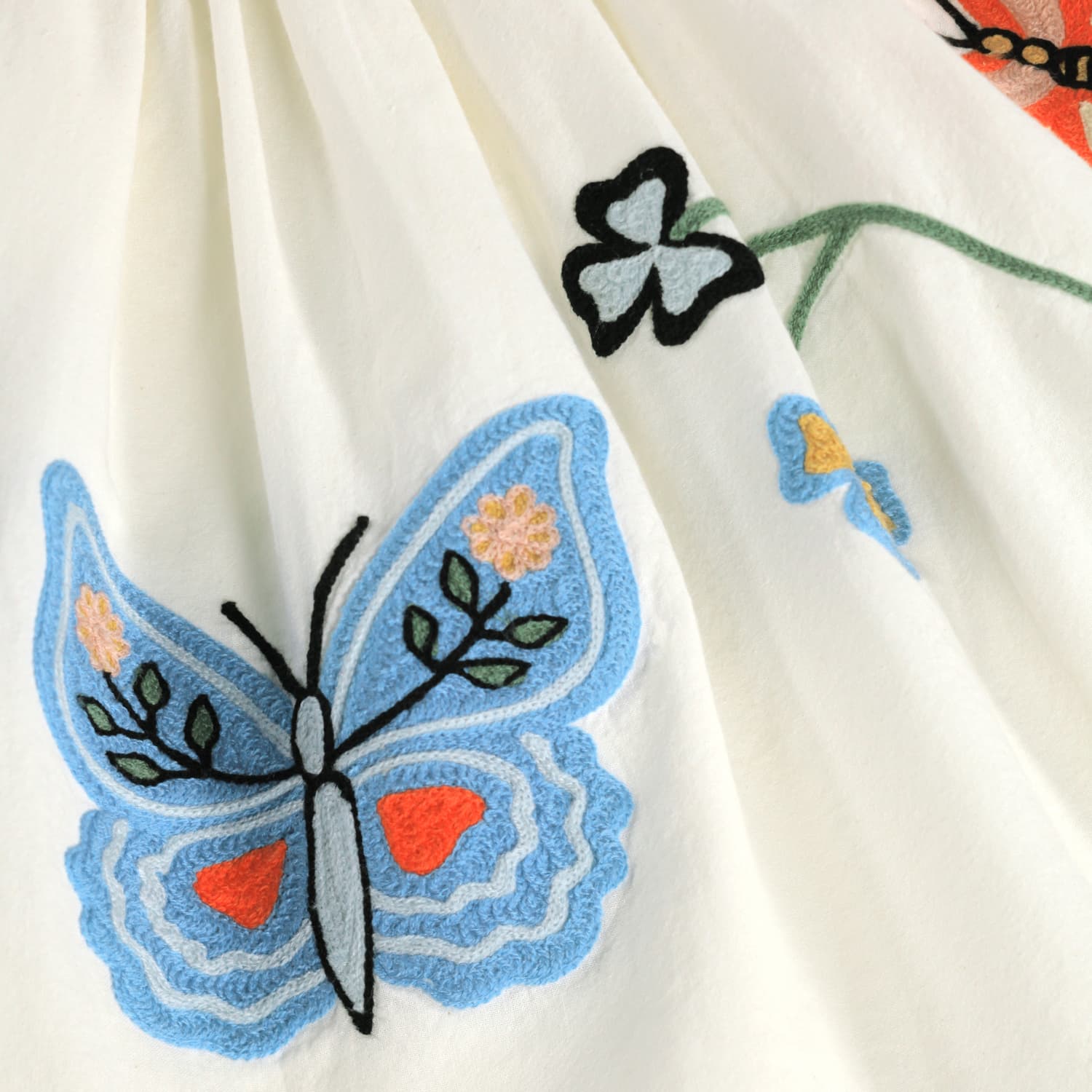 Rochie lungime medie produs din bumbac moale organic cu guler rotund si maneci delicate fluturas. Rochia are un fit usor si larg cu un fermoar invizibil in spate ceea ce o face usor de imbracat