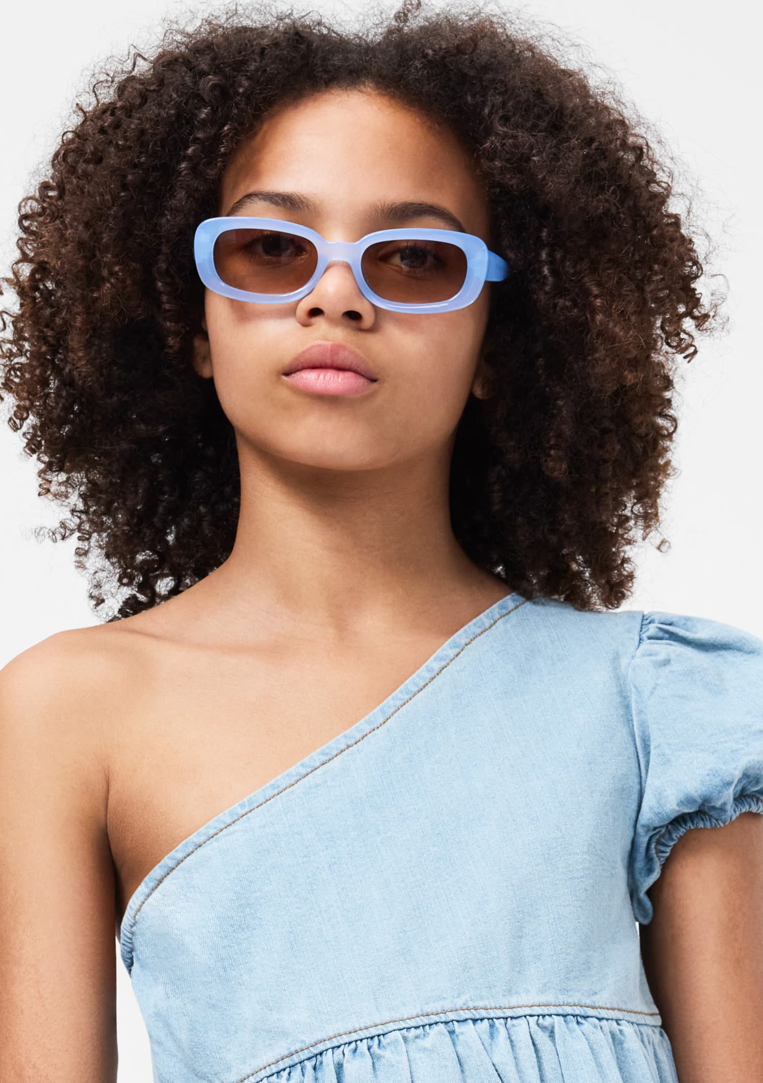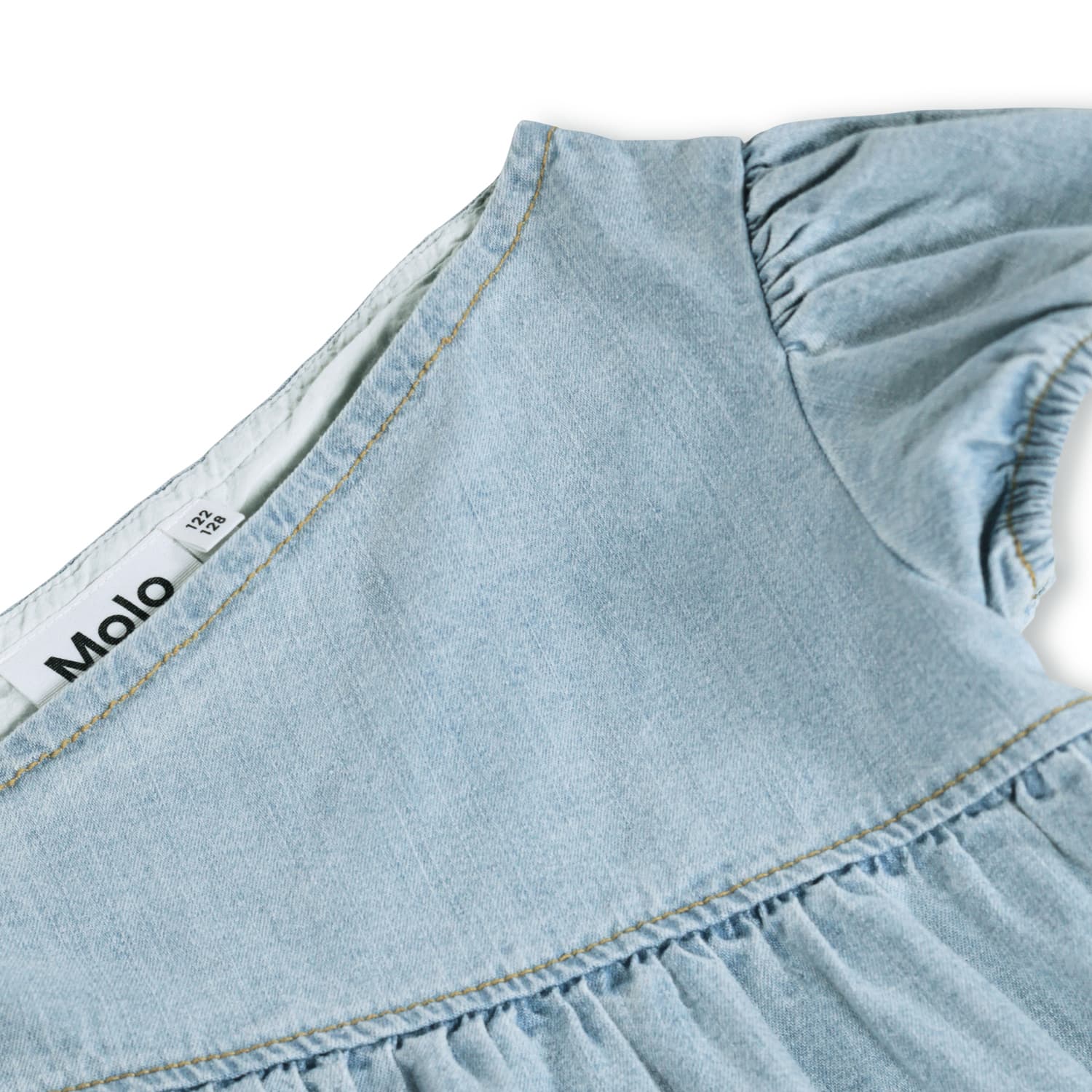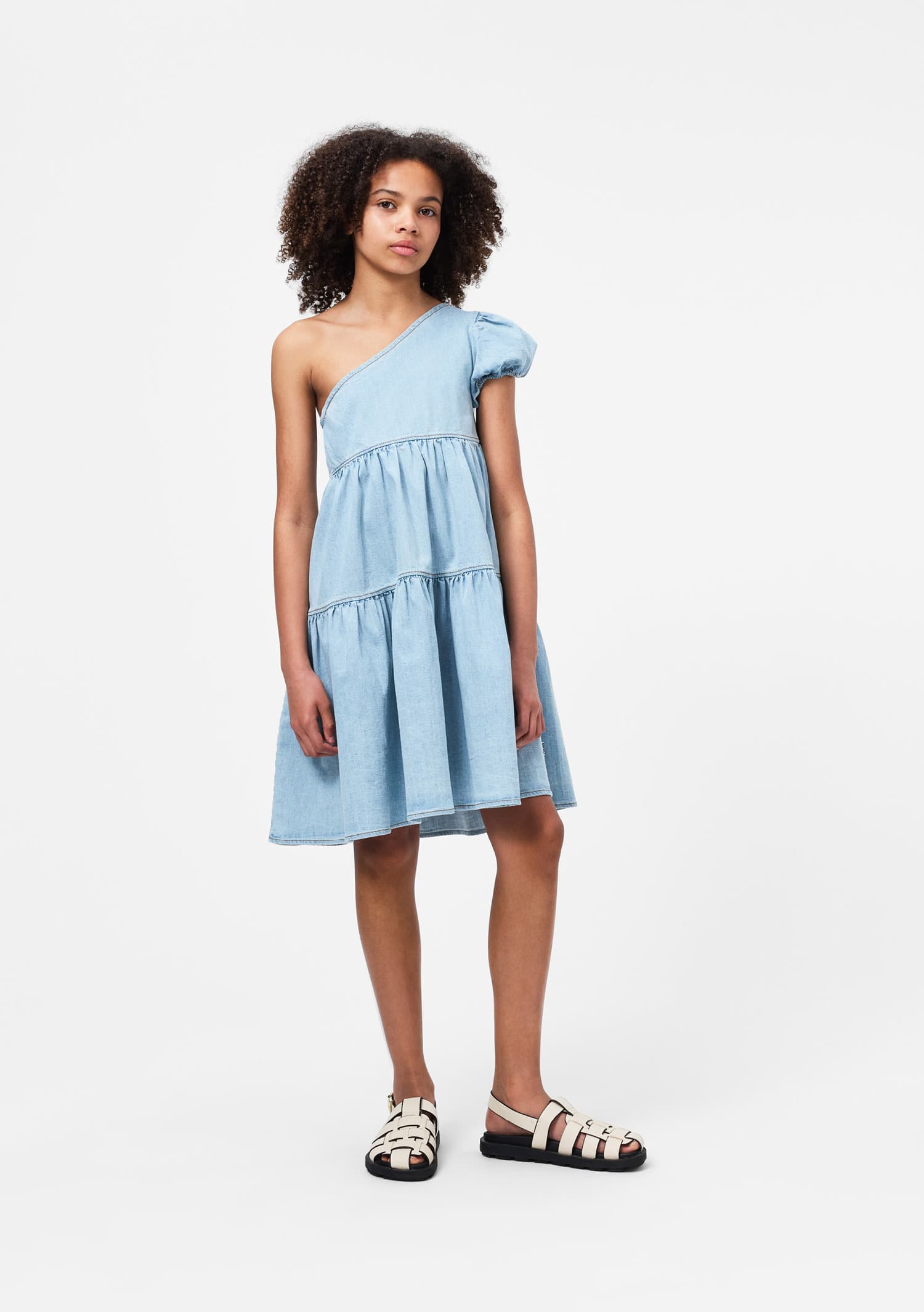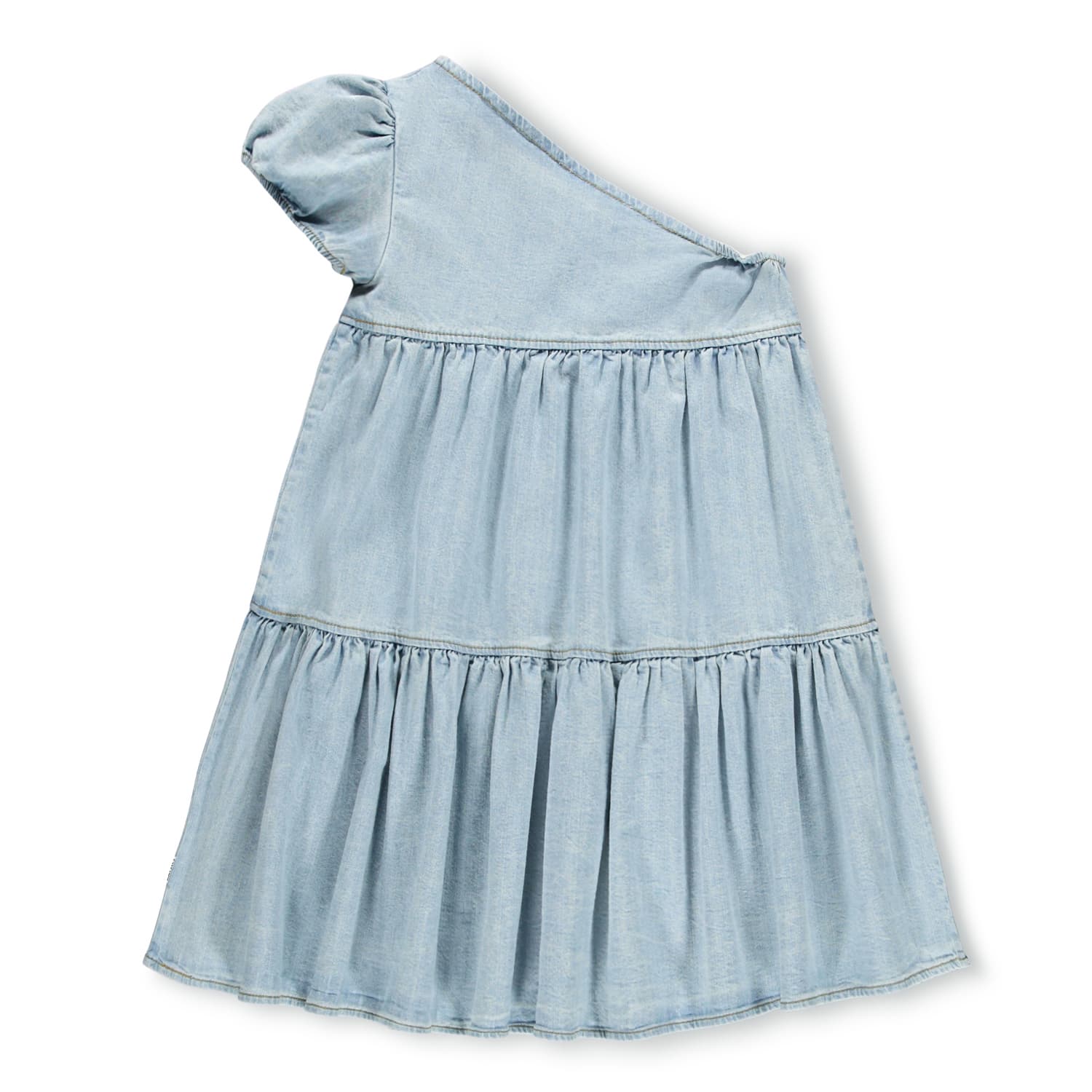 Rochie denim pe un umar produsa din bumbac moale, organic cu om maneca voluminoasa si elastic in spate pentru mai mult confort