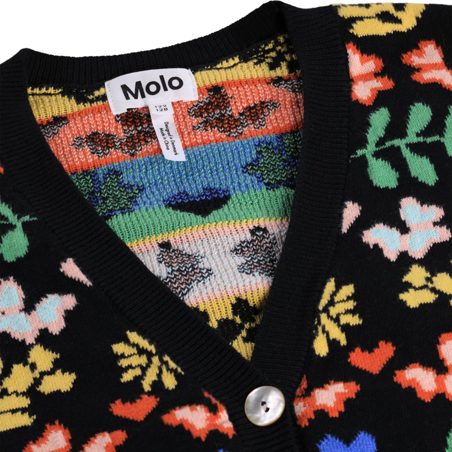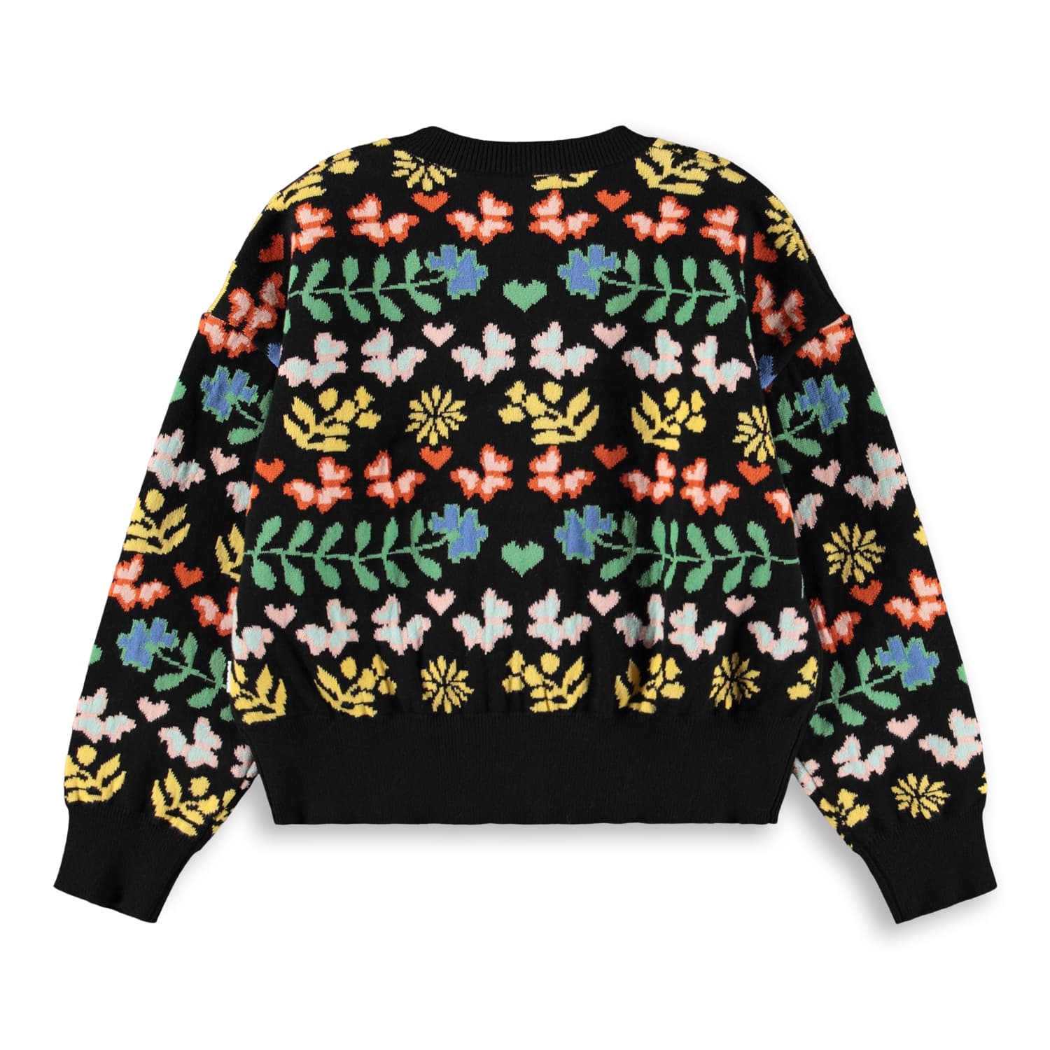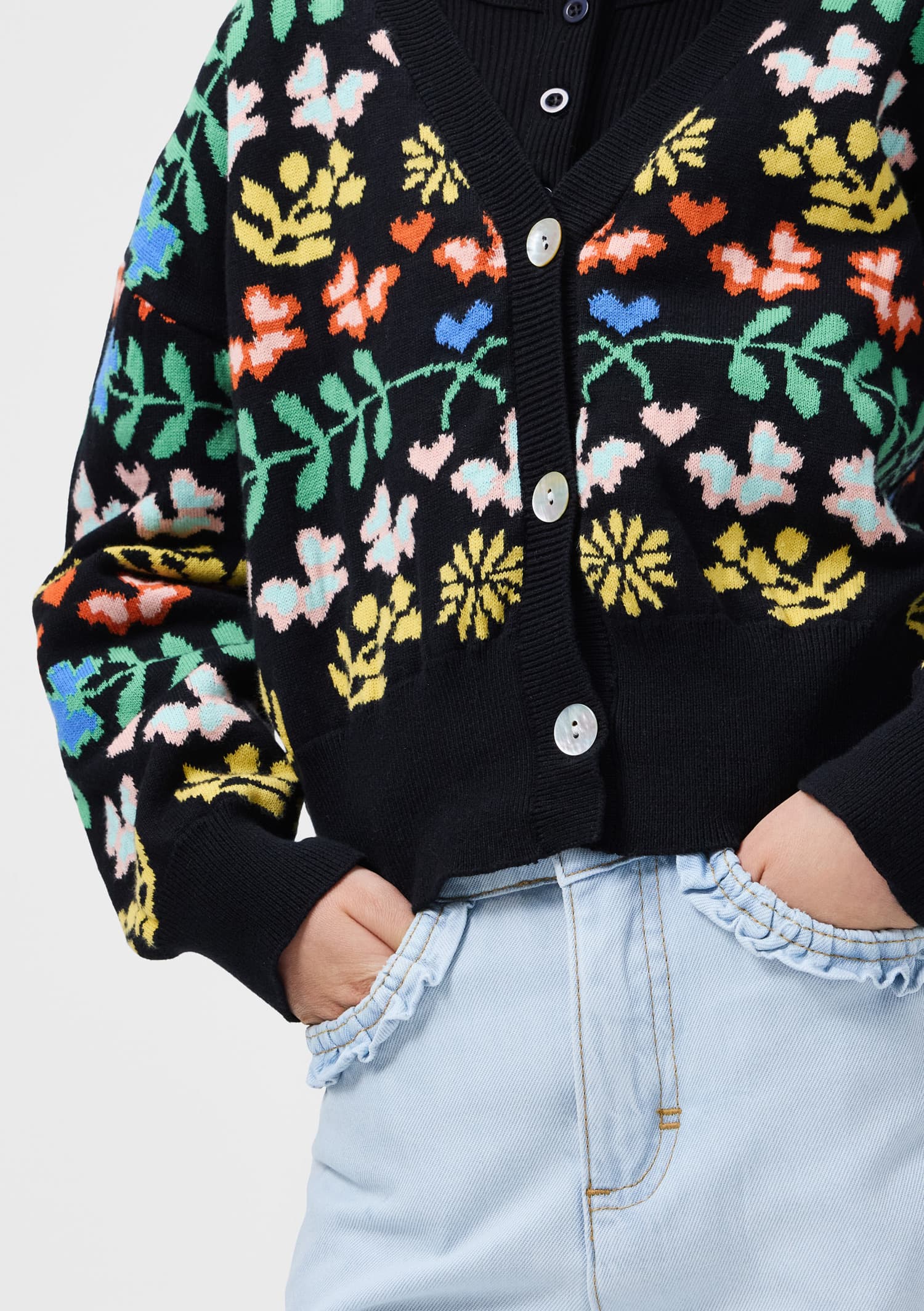 Cardigan negru tricotat din bumbac moale cu un desen colorat de flori si frunze. Cardiganul este un mnodel larg, cu guler V si nasturi.