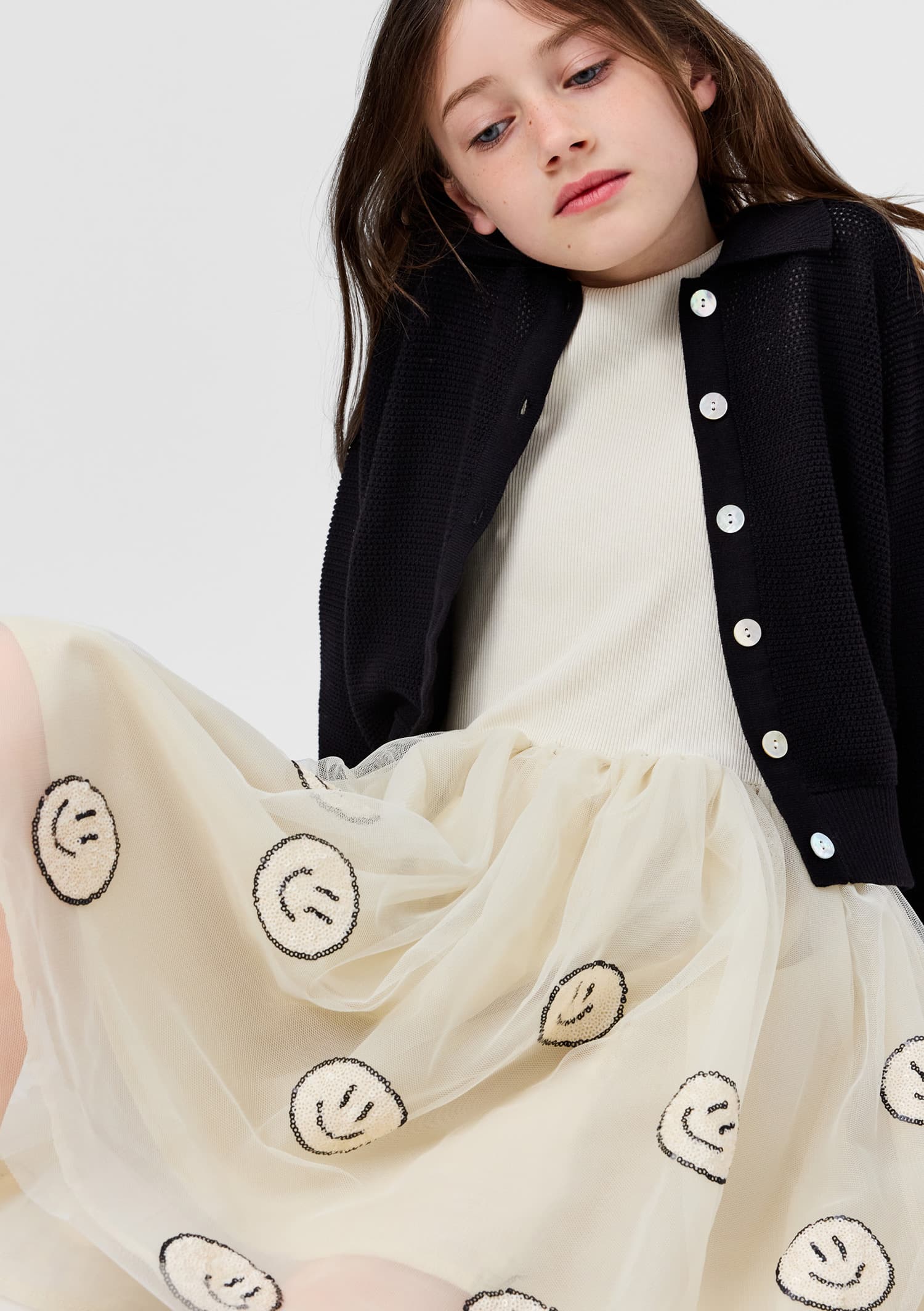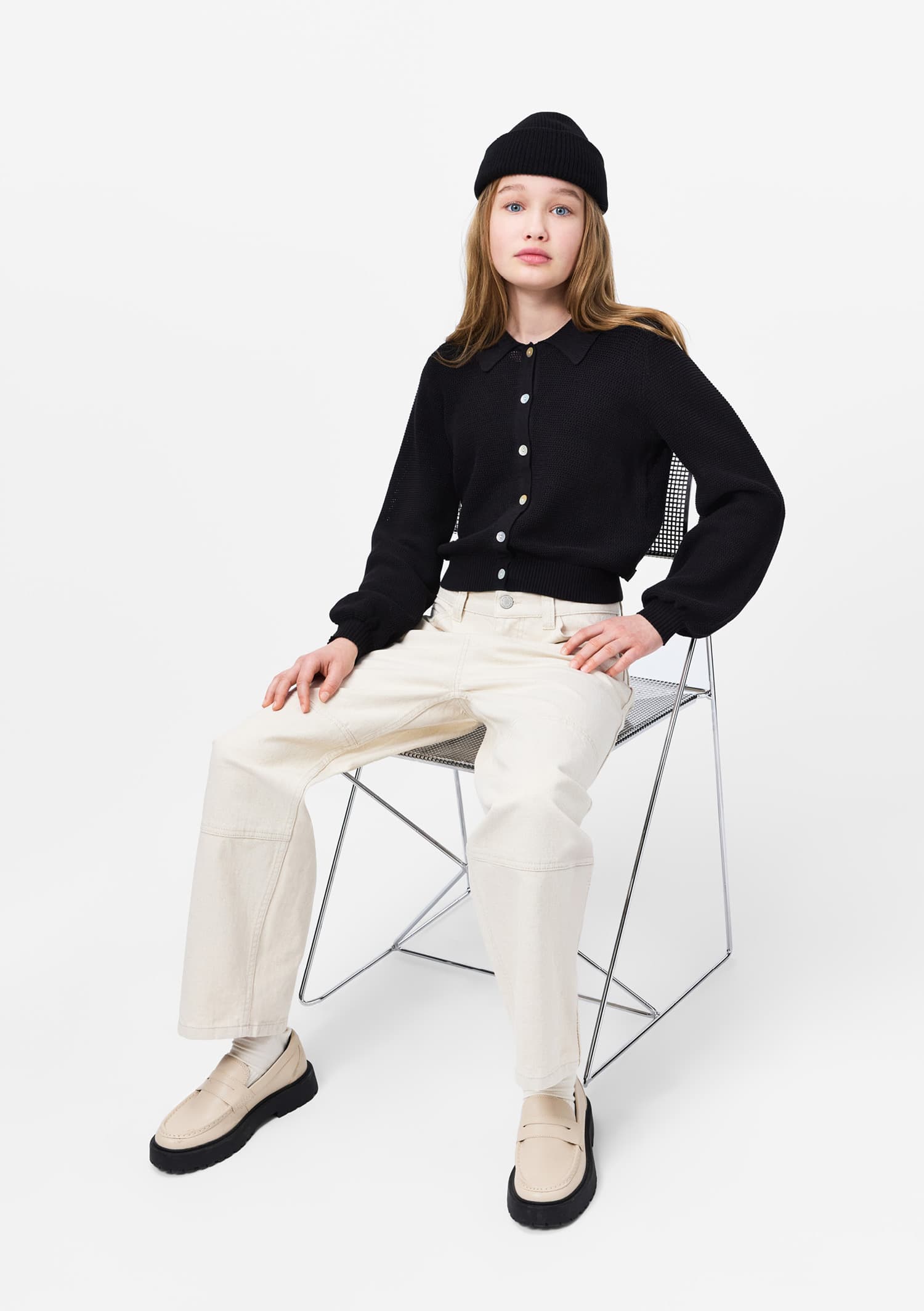 Cardigan negru crosetat produs din bumbac organic. Cardiganul are mineci voluminoase, un guler clasic si nasturi in fata.