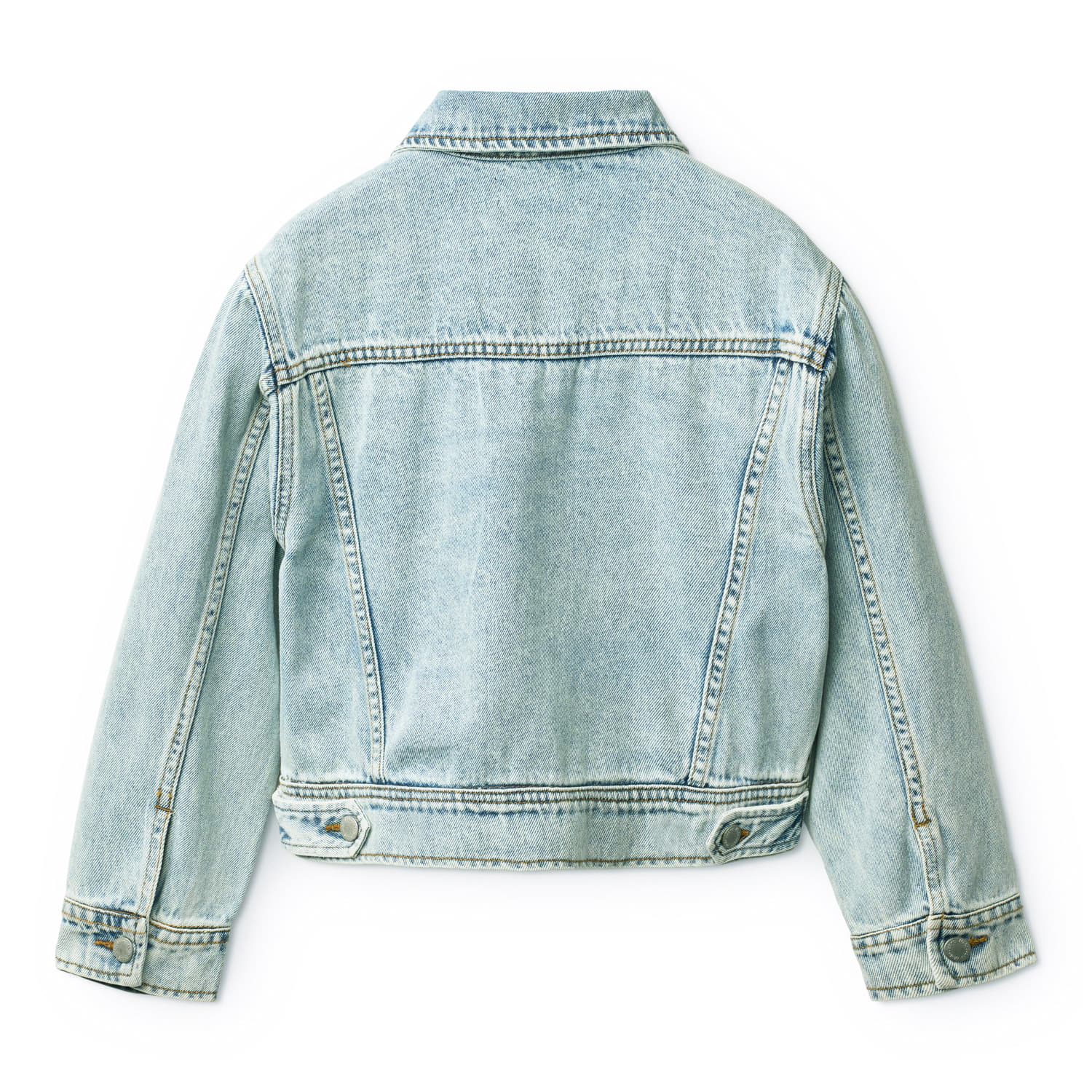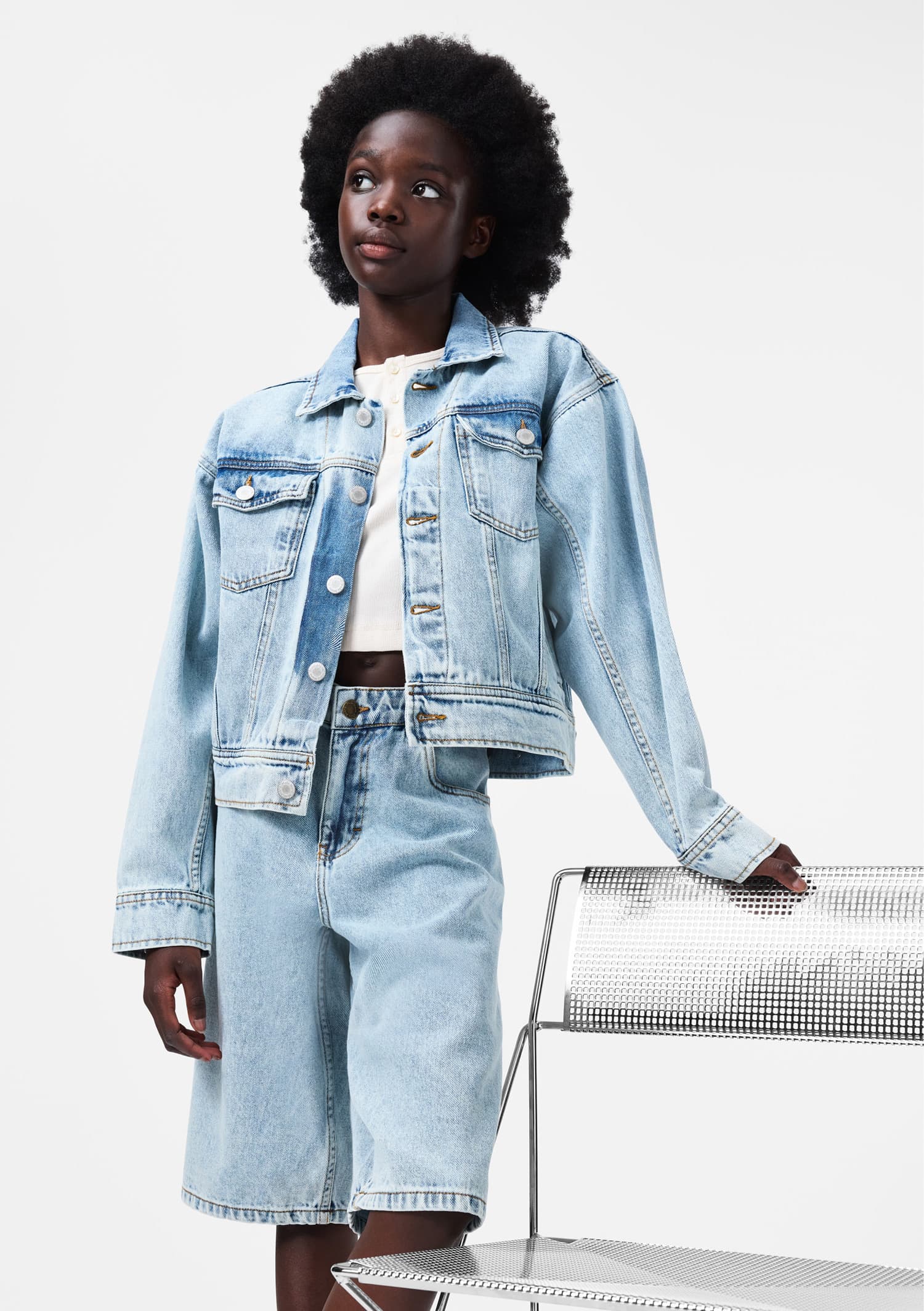 Scurta din blugi produsa din bumbac cu un fit larg, guler, nasturi in fata, buzunare in parti, buzunare la piept, si capse ajustabile in spate.