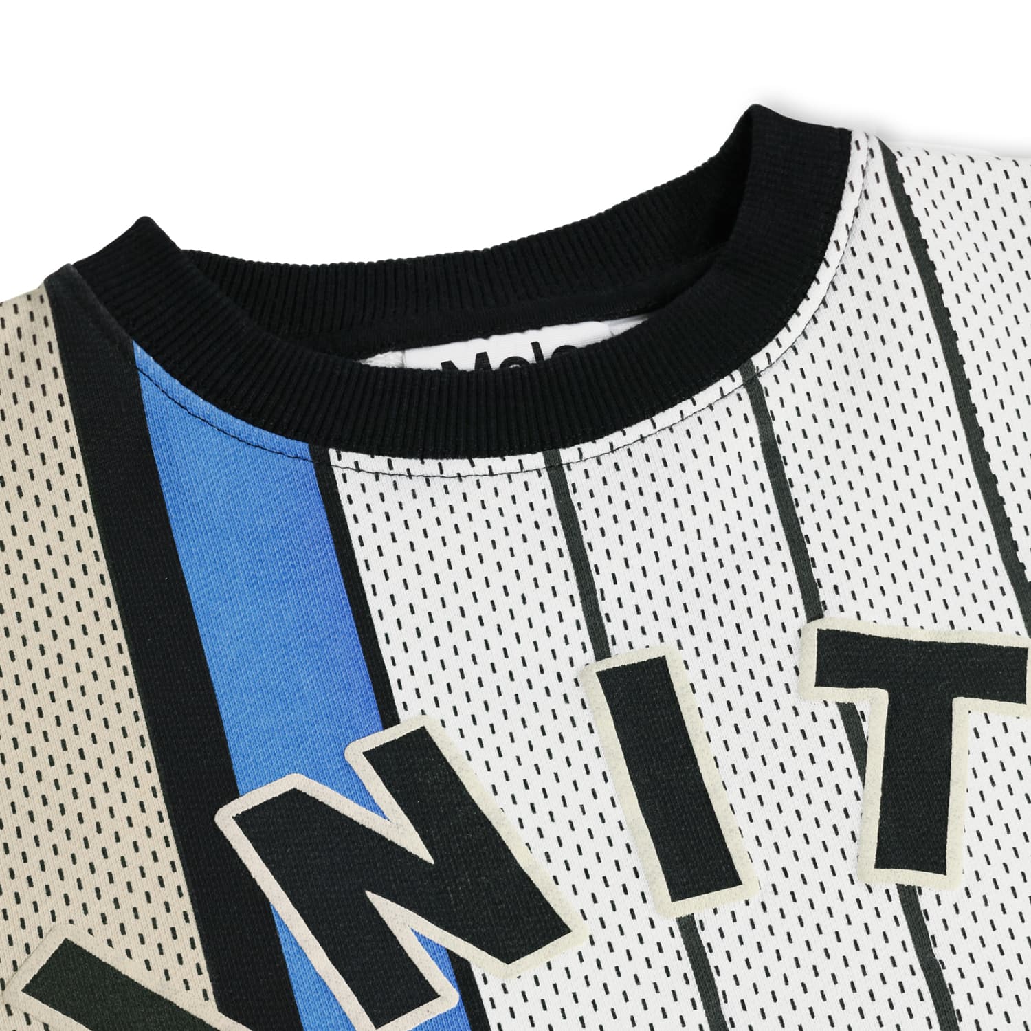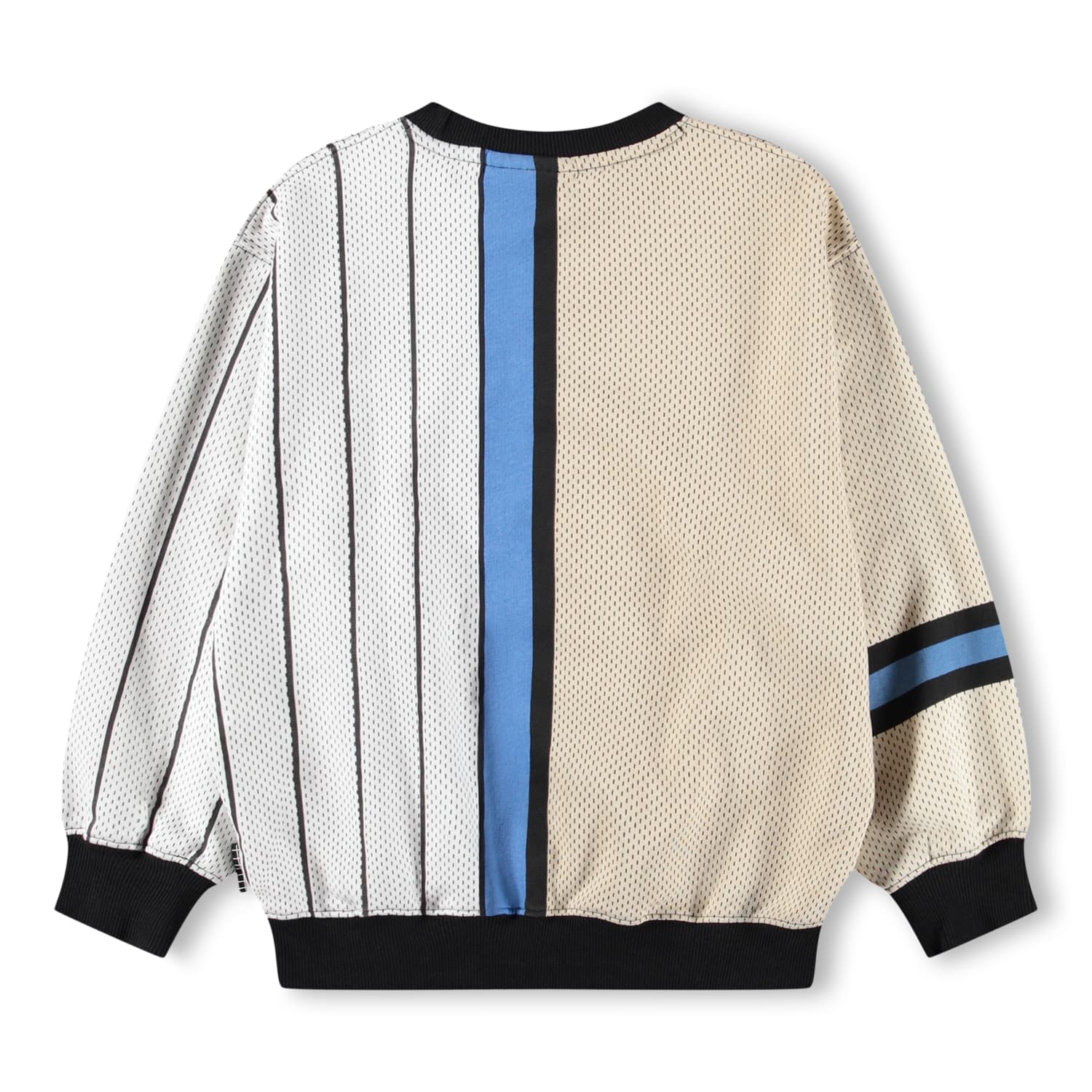 Pulover bicolor in alb si bej produs din bumbac moale organic. Puloverul are un fit larg si relaxat cu un look sportiv inspirat din sportul baschet si textul Unity in fata.