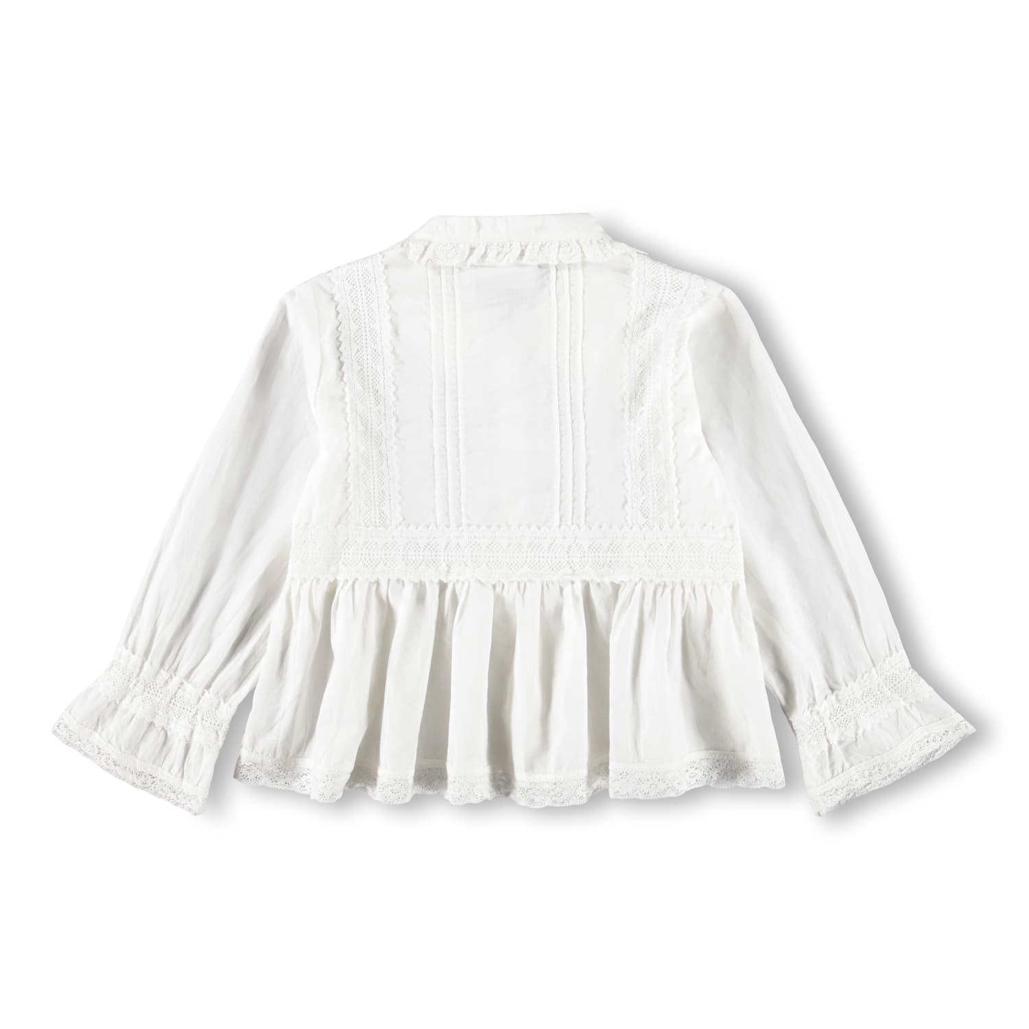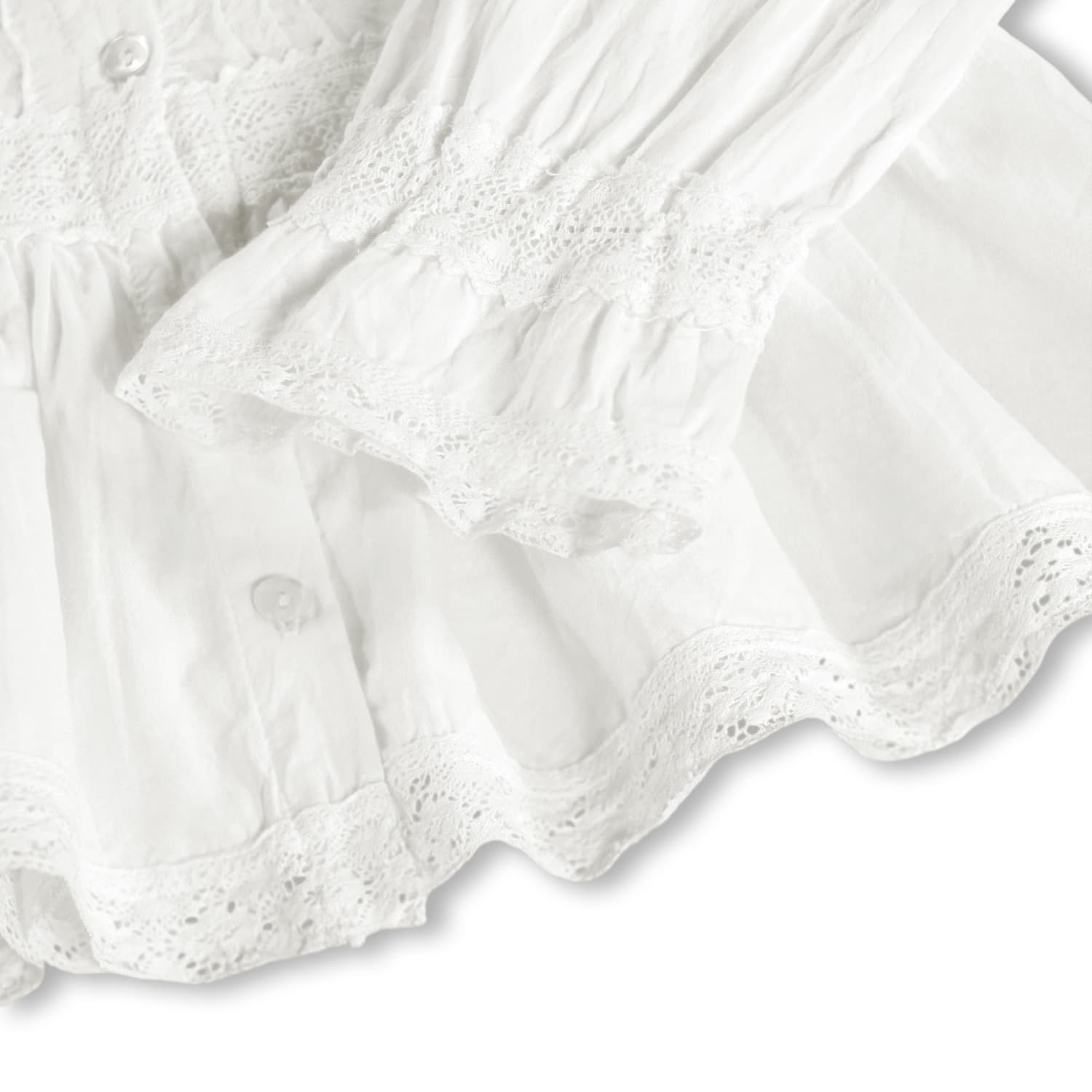 Camasa alba produsa din bumbac moale, organic cu detalii delicate de dantela , mansete late, si guler decorativ pentru un look elegant.