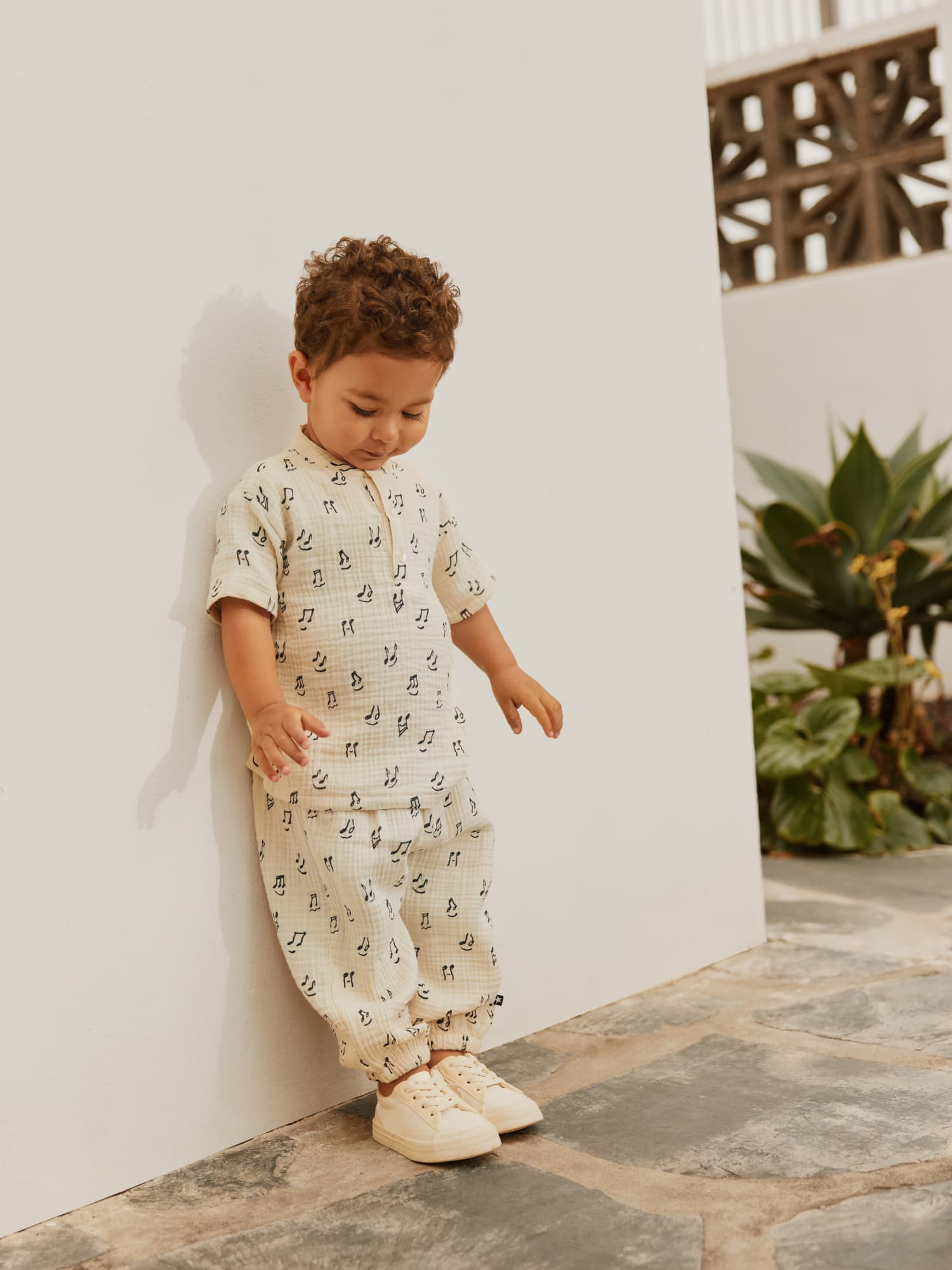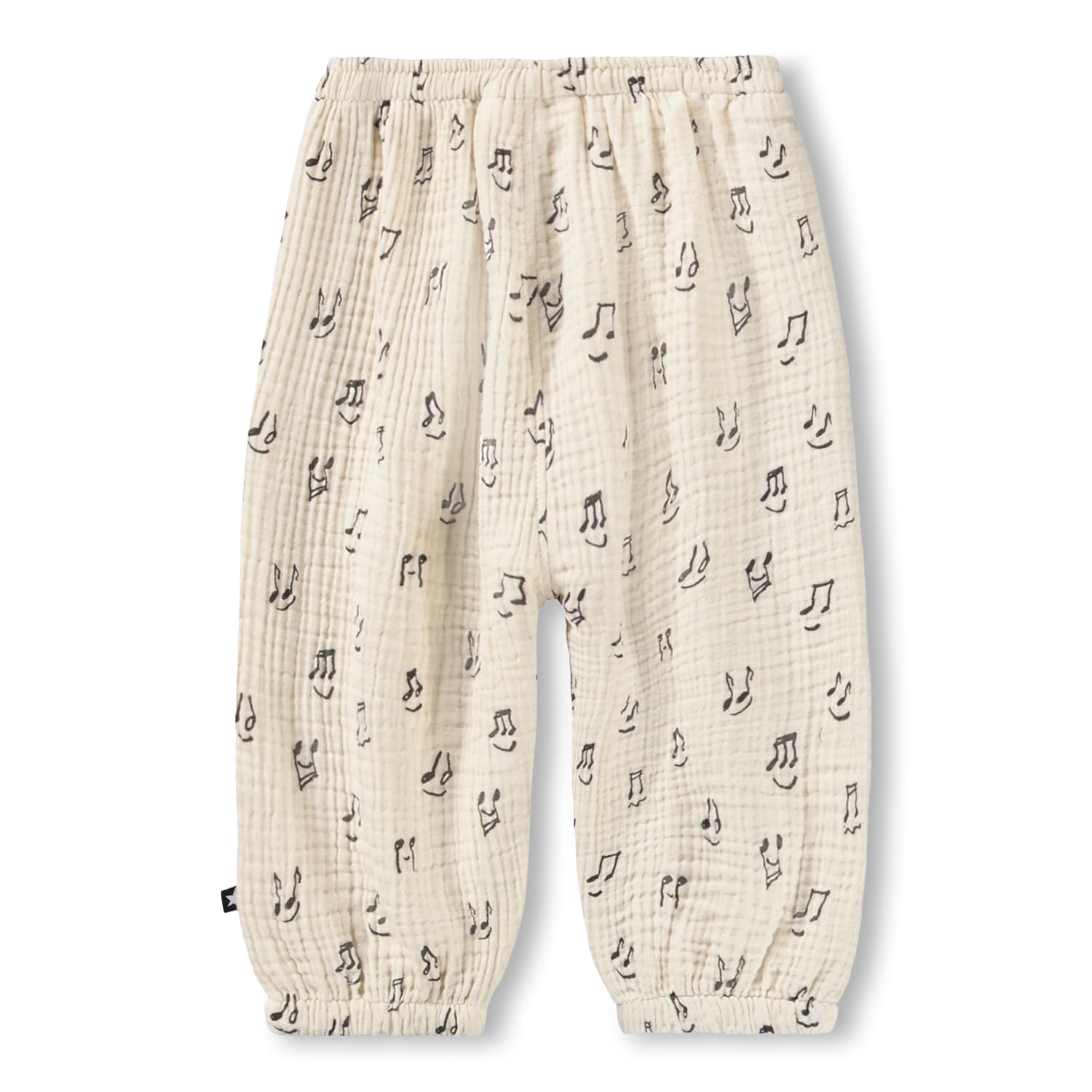 Pantaloni culoarea bej pentru cei mai mici produs din bumbac organic cu un print de note muzicale. Ei au un fit larg, cu elastic in talie si elastic la glezna, ceea ce-i face usor de imbracat. Pantalonii sunt usori si comfortabili -perfecti