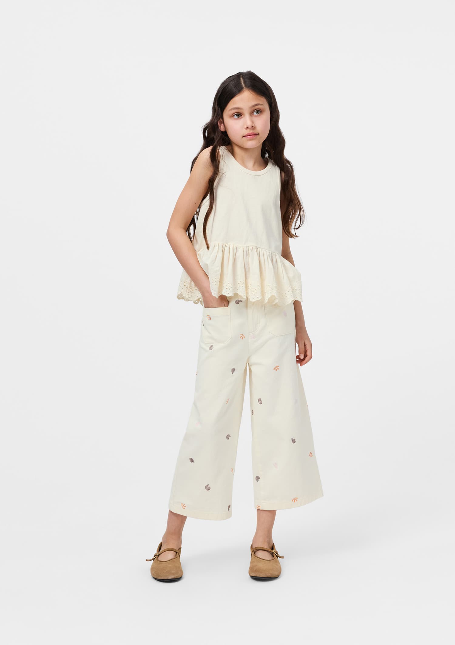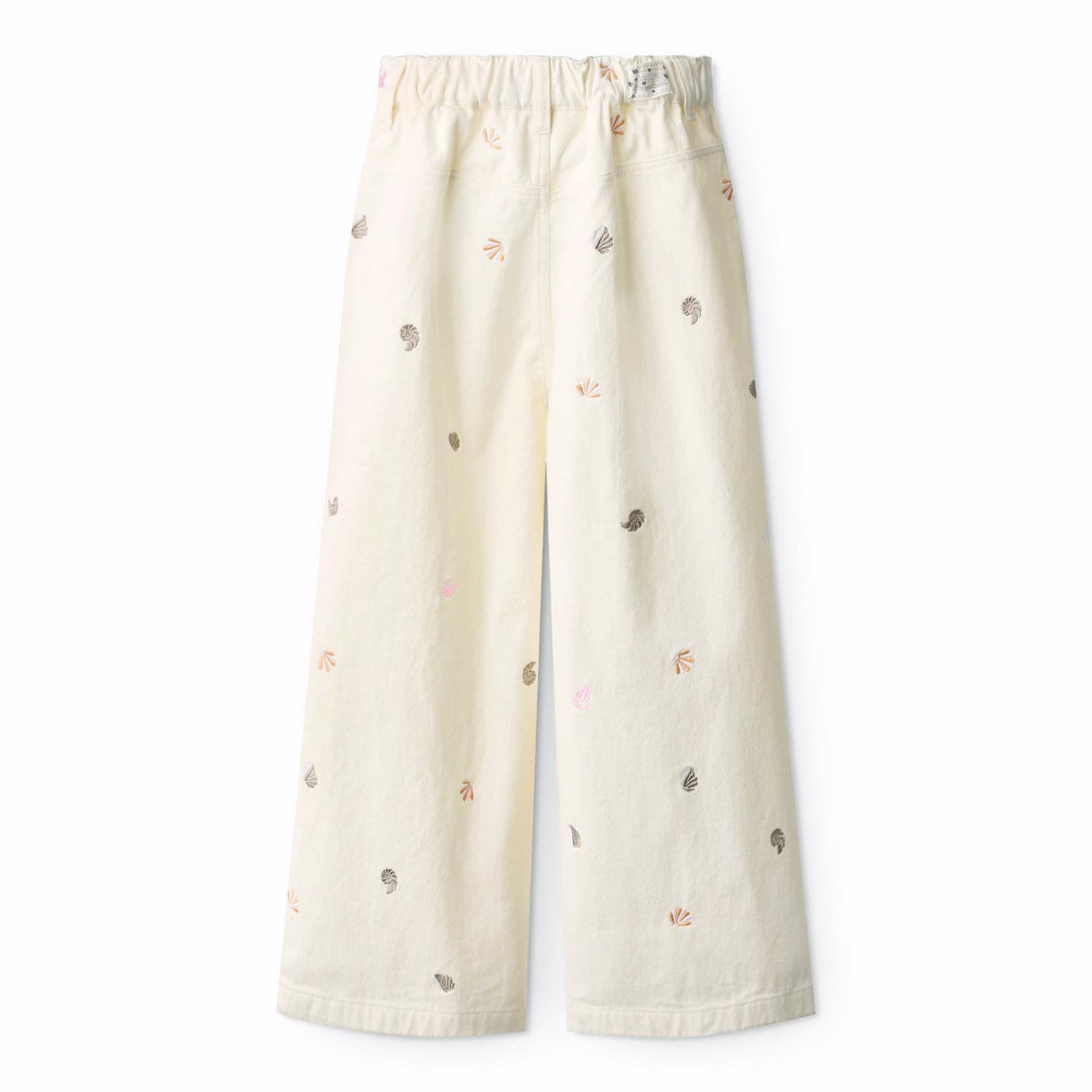 Pantaloni albi produsi din bumbac organic cu broderie fina. Pantalonii au model larg, buzunare in fata, elastic in spate , gauri pentru centura, si fermnoar cu nasture in fata.