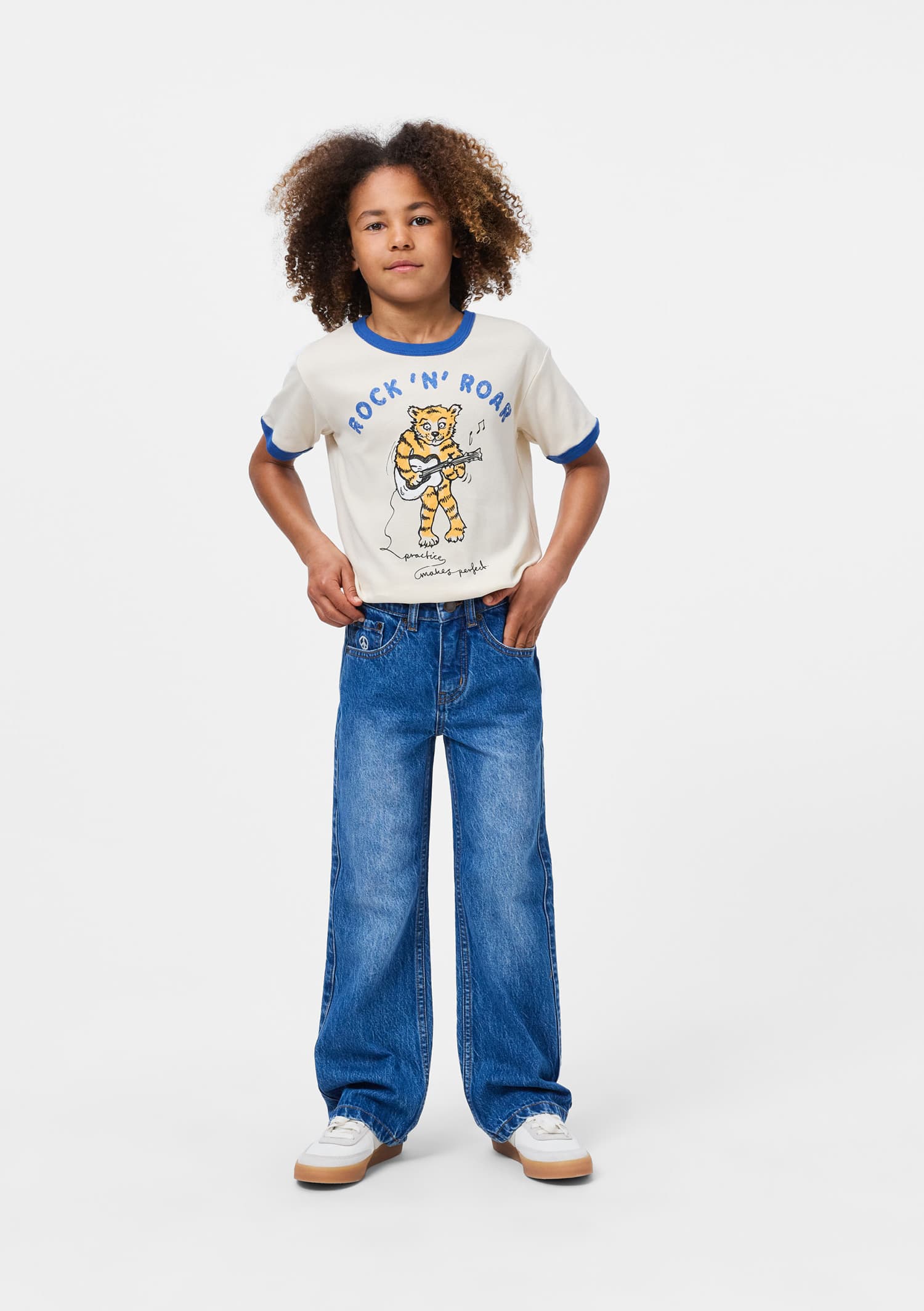 Blugi albastri denim din bumbac. Blugii au 5 buzunare, model drept si un fit regular cu elastic ajustabil in talie. Marimile mici (92-134) se incheie cu capsa, pe cind marimile 140-176 au un nasture clasic de blugi.