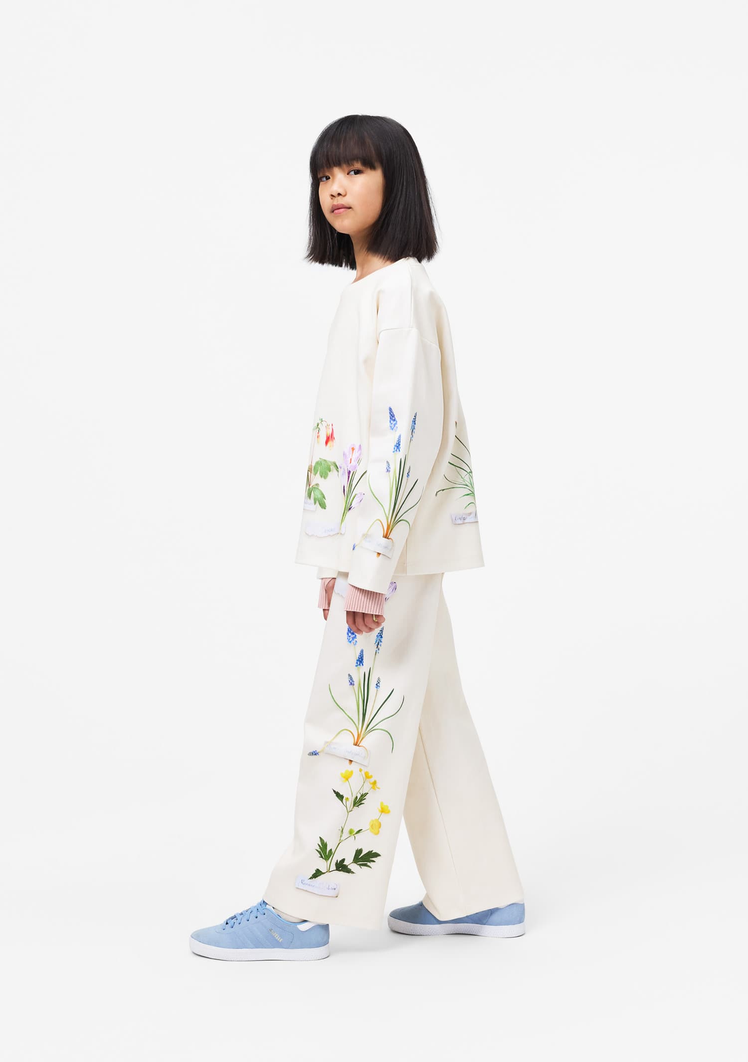 Pantaloni albi tricotaj din bumbac organic moale. Pantalonii au un fit larg si talie cu elastic, ceea ce le asigura comfort la purtat si imbracat. Modelul are motive de natura printate pe partea de jos a priciorului.