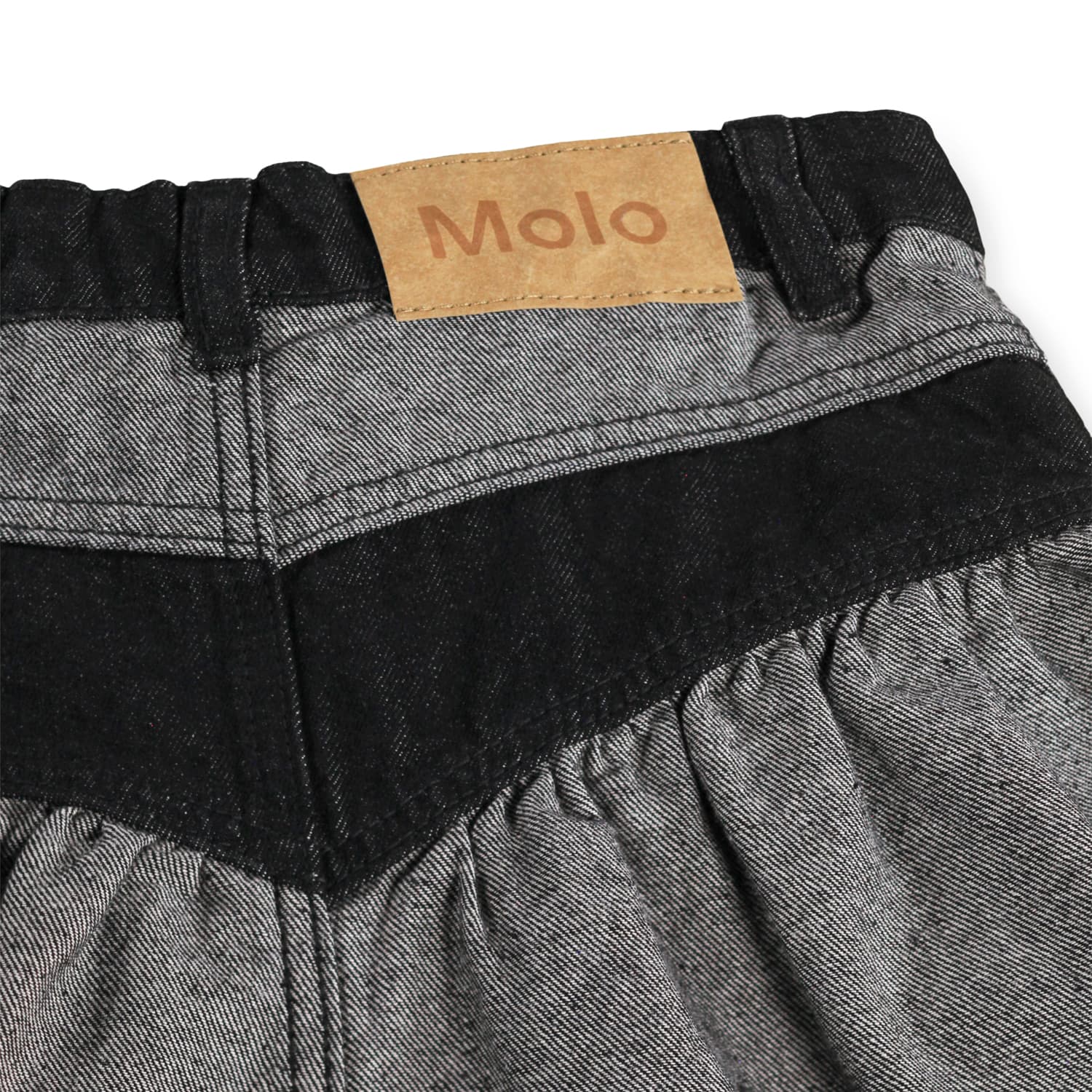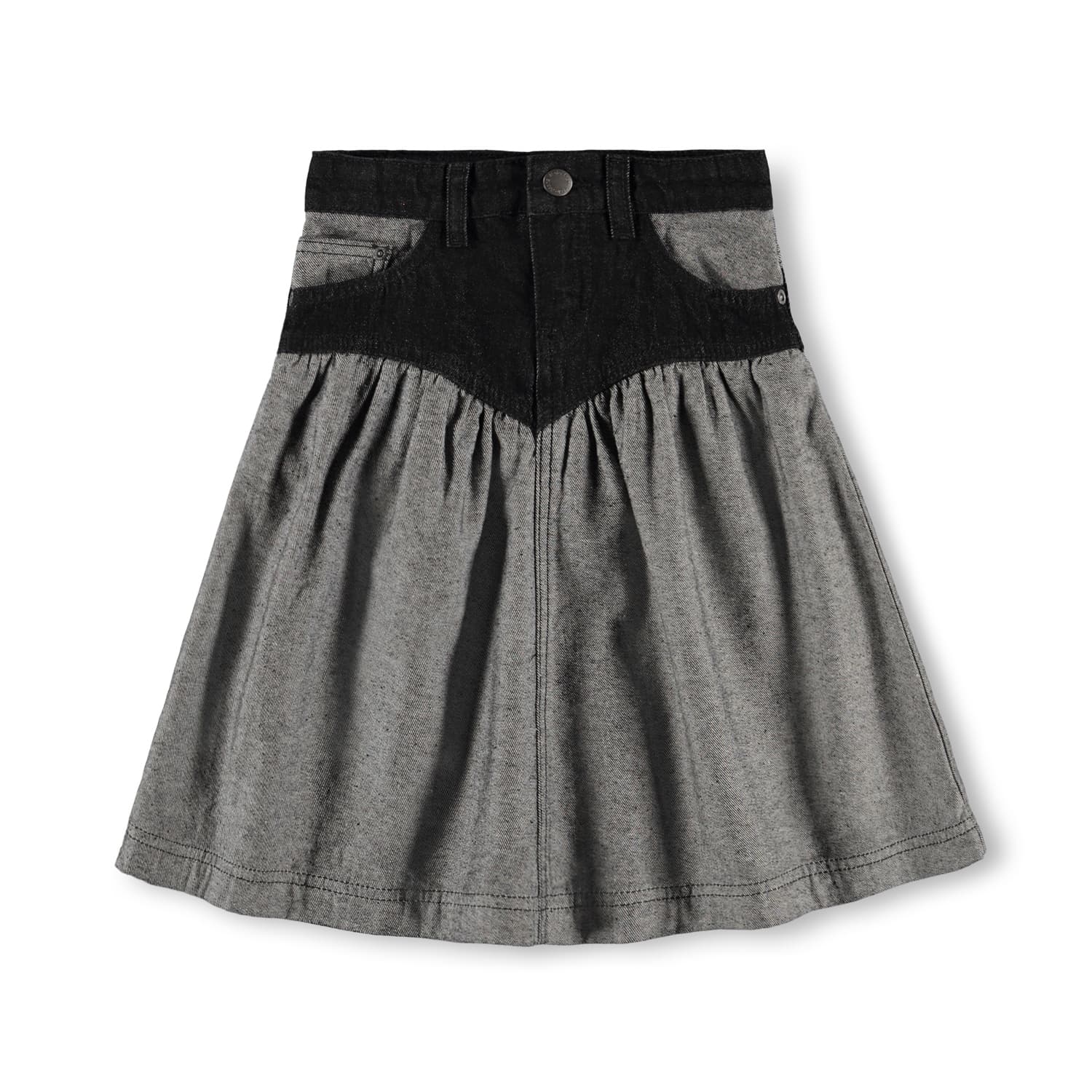 O fusta frumoasa din denim in doua tonuri produsa din bumbac organic cu un model unic. Fusta are trei buzunarte practice, capse la incheietoare disponibile pina la marimea 140