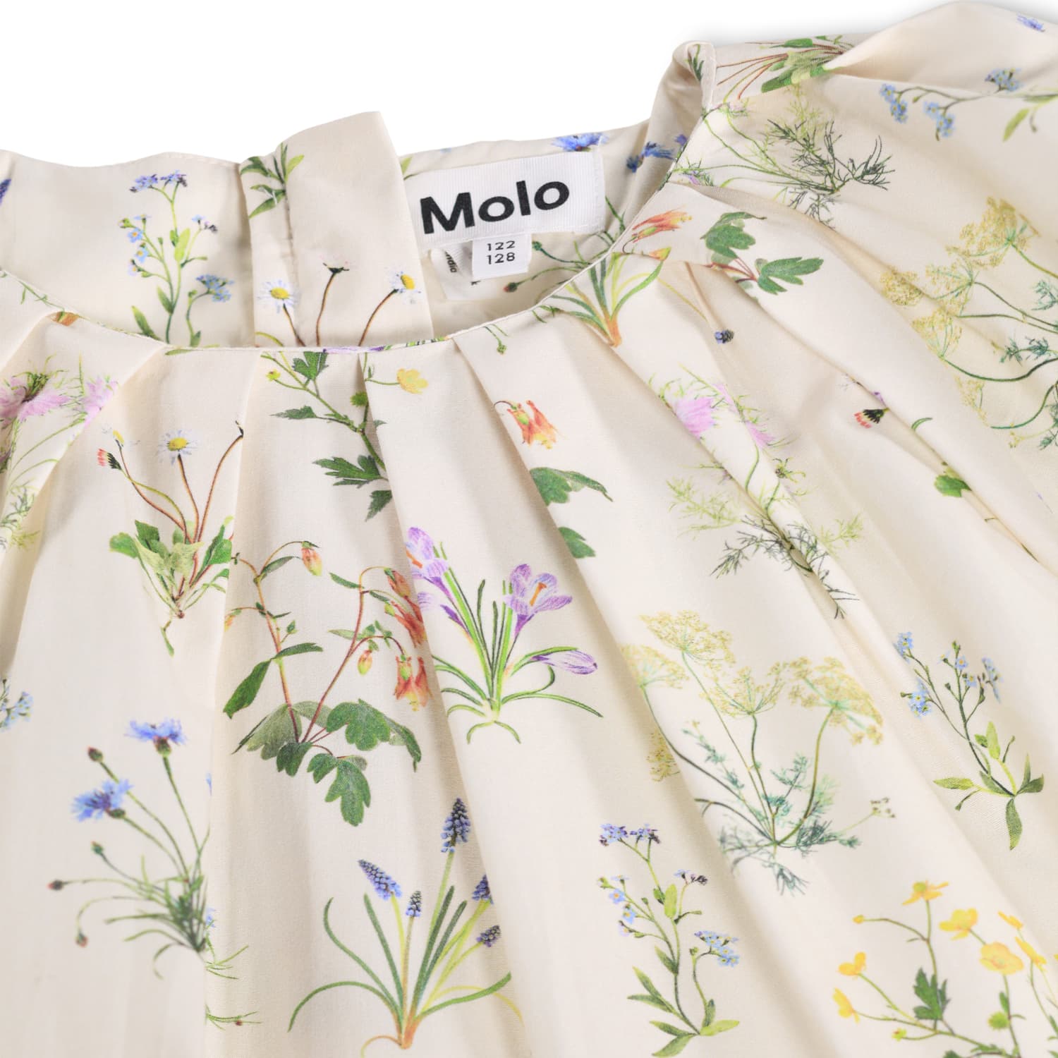Rochie alba din bumbac organic, moale cu mineci pufoase si pliseuri fine in jurul gitului. Un fermoar invizibil in spate face rochia usor de imbracat. Rochia are un print colorat floral ceea ce ii adauga viata