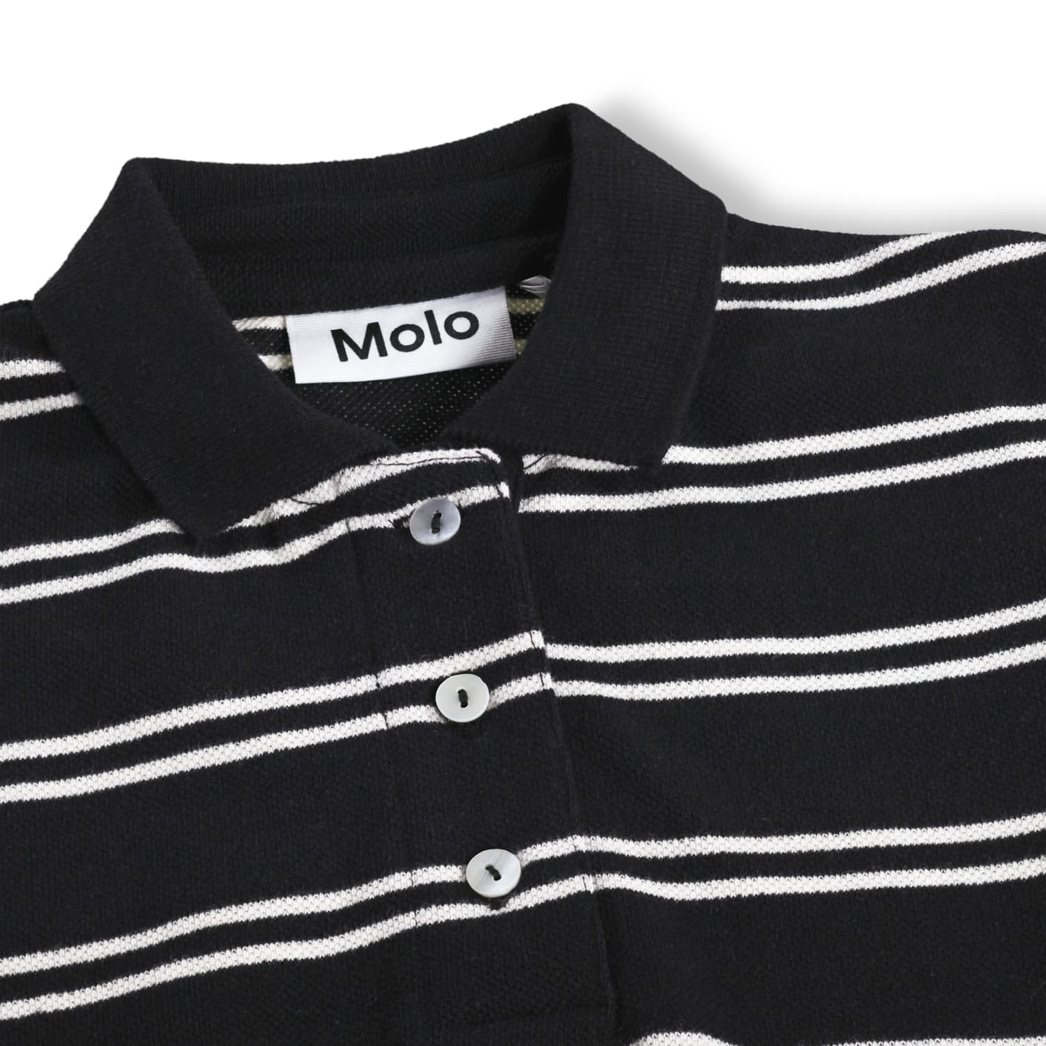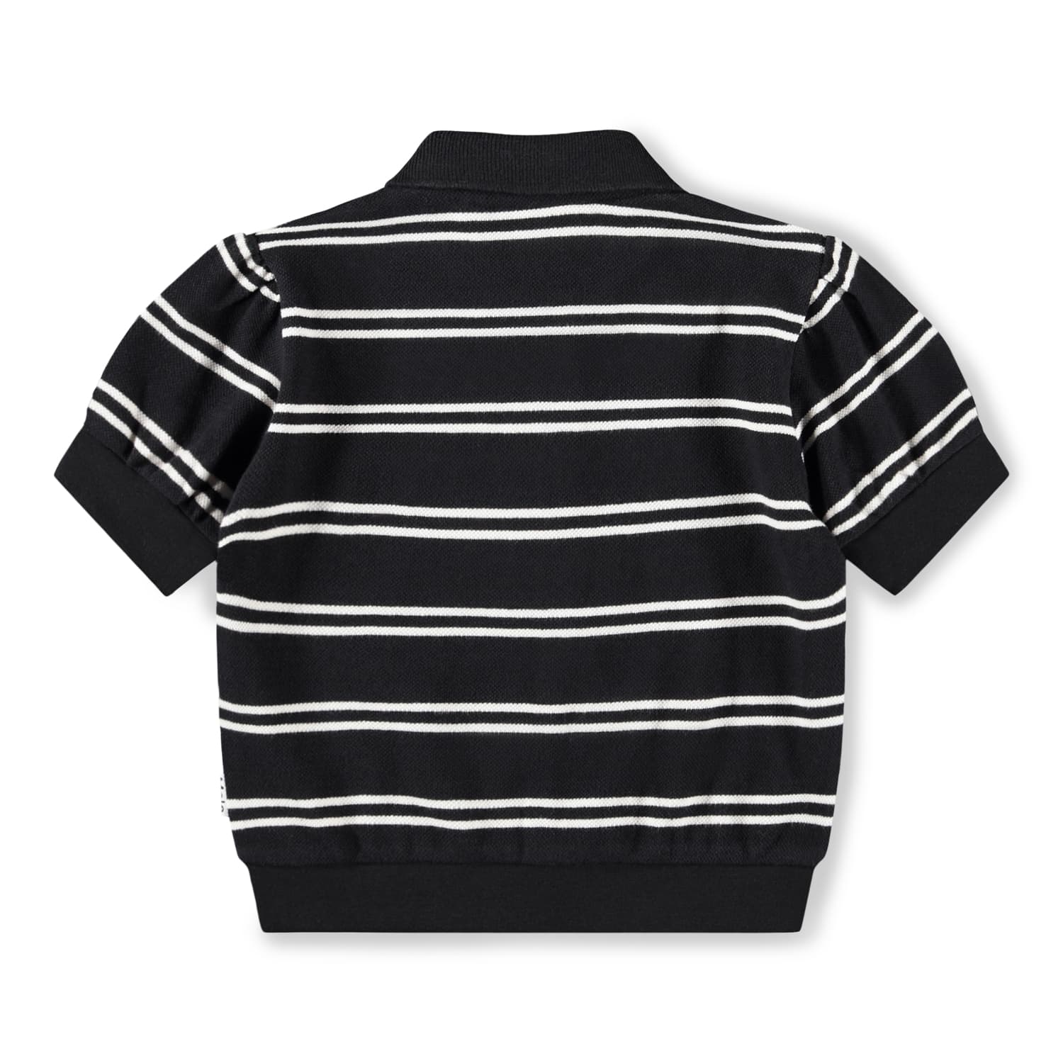 Maiou polo cu maneci scurte produs din bumbac tricotat moale, organic cu dungi inguste albr/negru. Modelul are un guler clasic, cu nasturi in fata, cu un fit relaxat si un look sport.