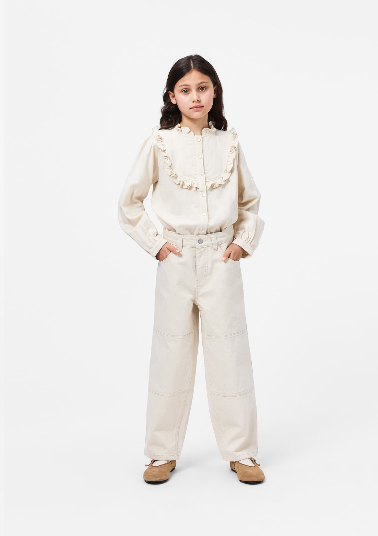 Camasa alba produsa din bumbac moale, organic cu volanase la guler , cu nasturi la guler si maneca. Camasa are un fit regular si detalii fine la maneci si spate.