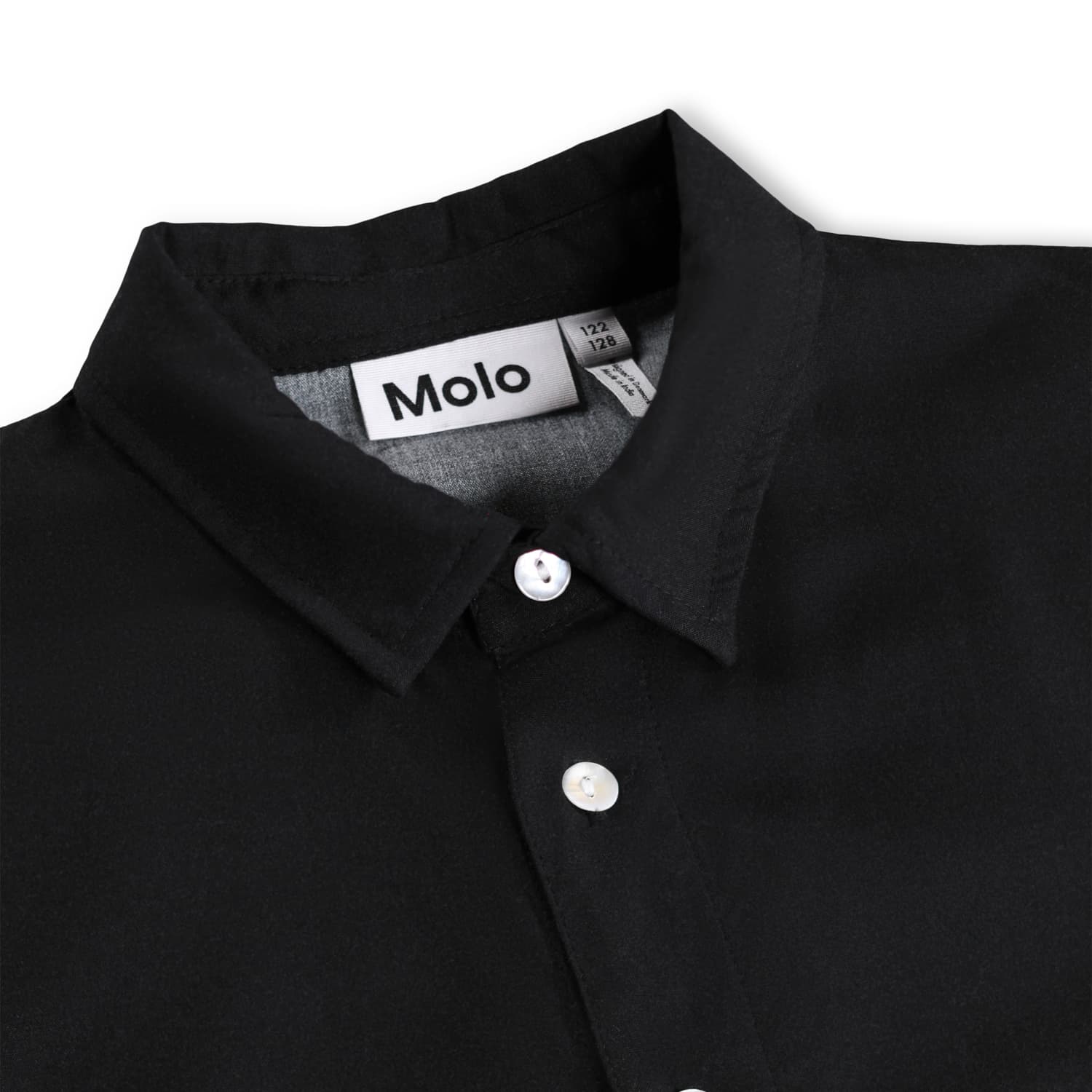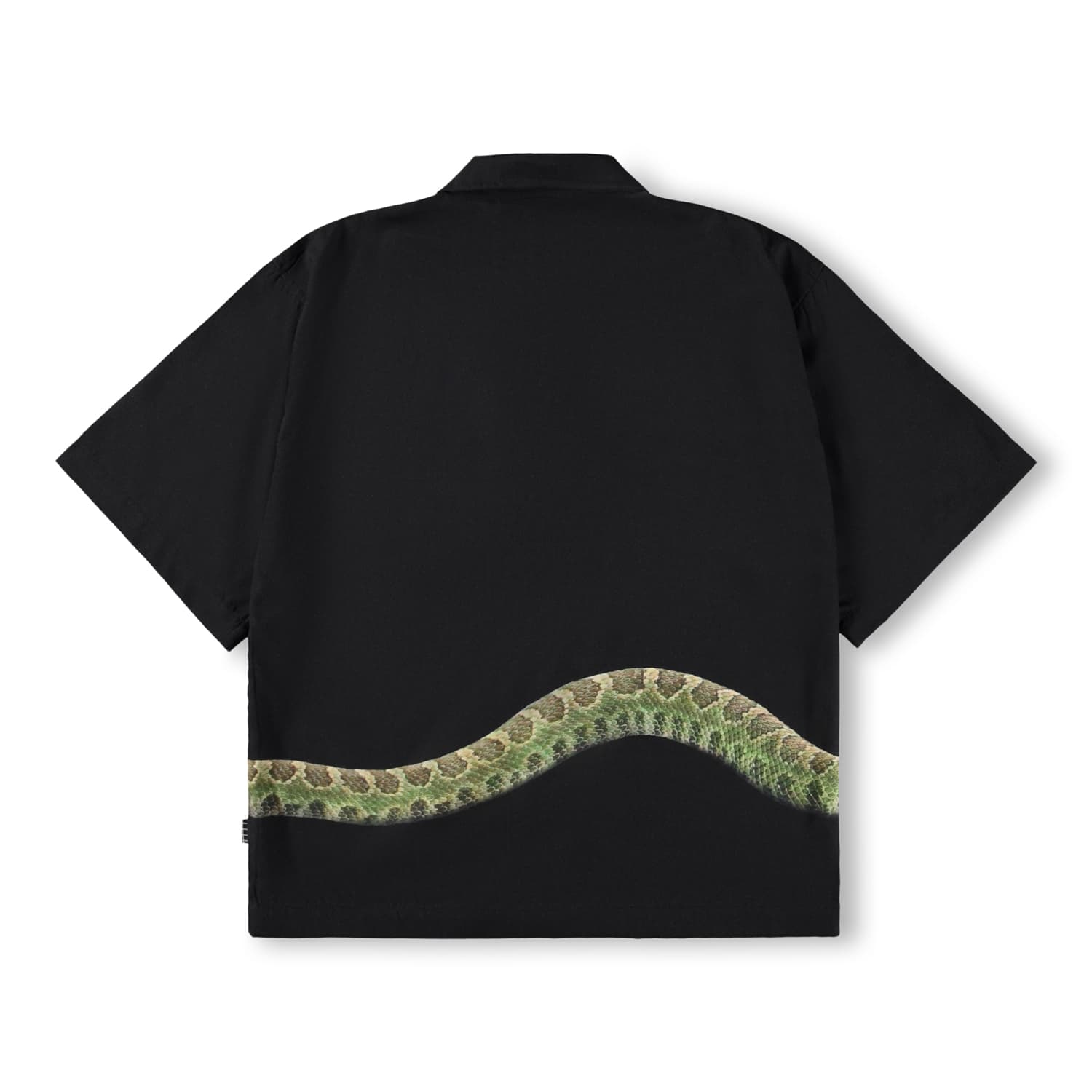 Camasa neagra produsa din viscoza moale cu mineci largi, guler clasic, si cu nasturi in fata. Aceasta camasa are un fit oversized cu un printe de sarpe care se extinde din fata spre spate