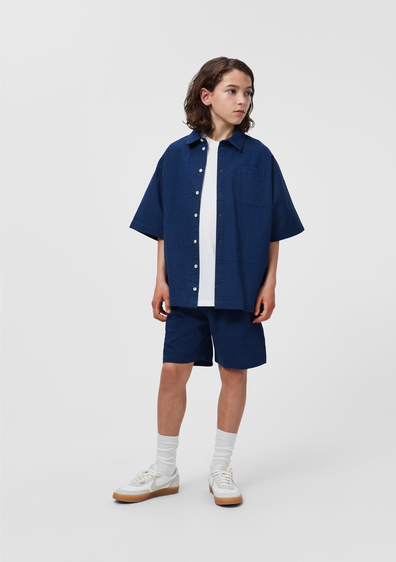 Camasa albastra produs din bumbac moale sifonat, cu maneci scurte largi , guler clasic si un fit relaxat, oversized.