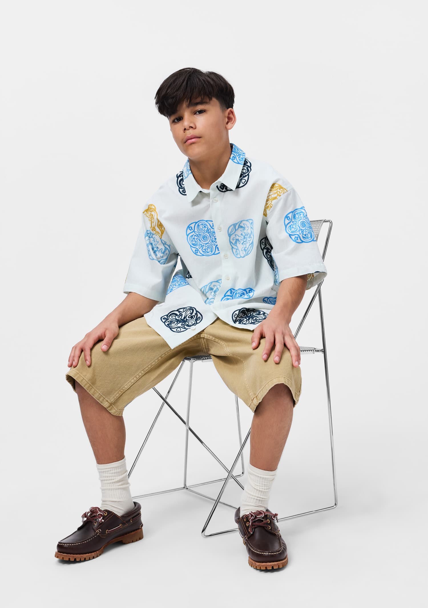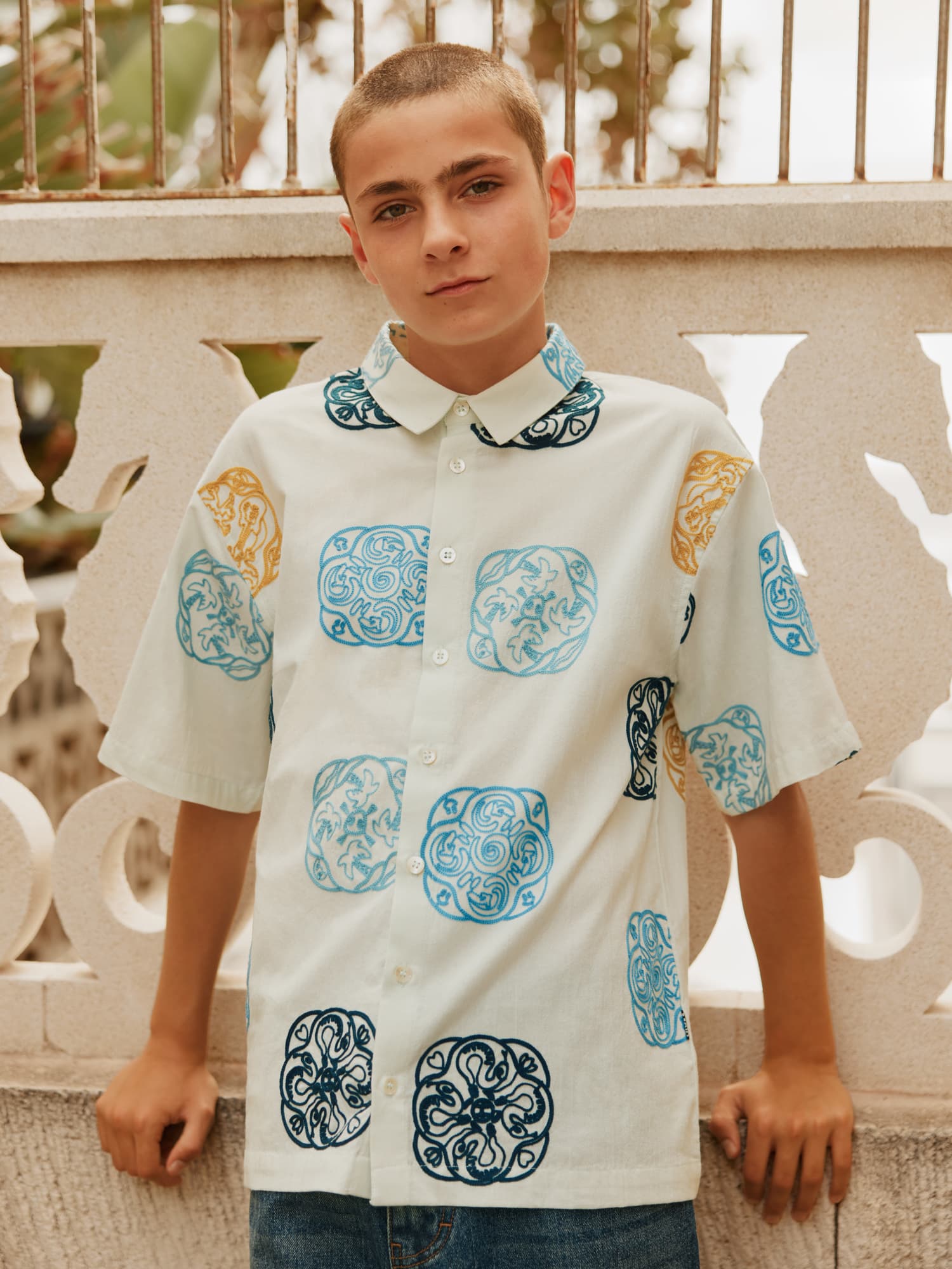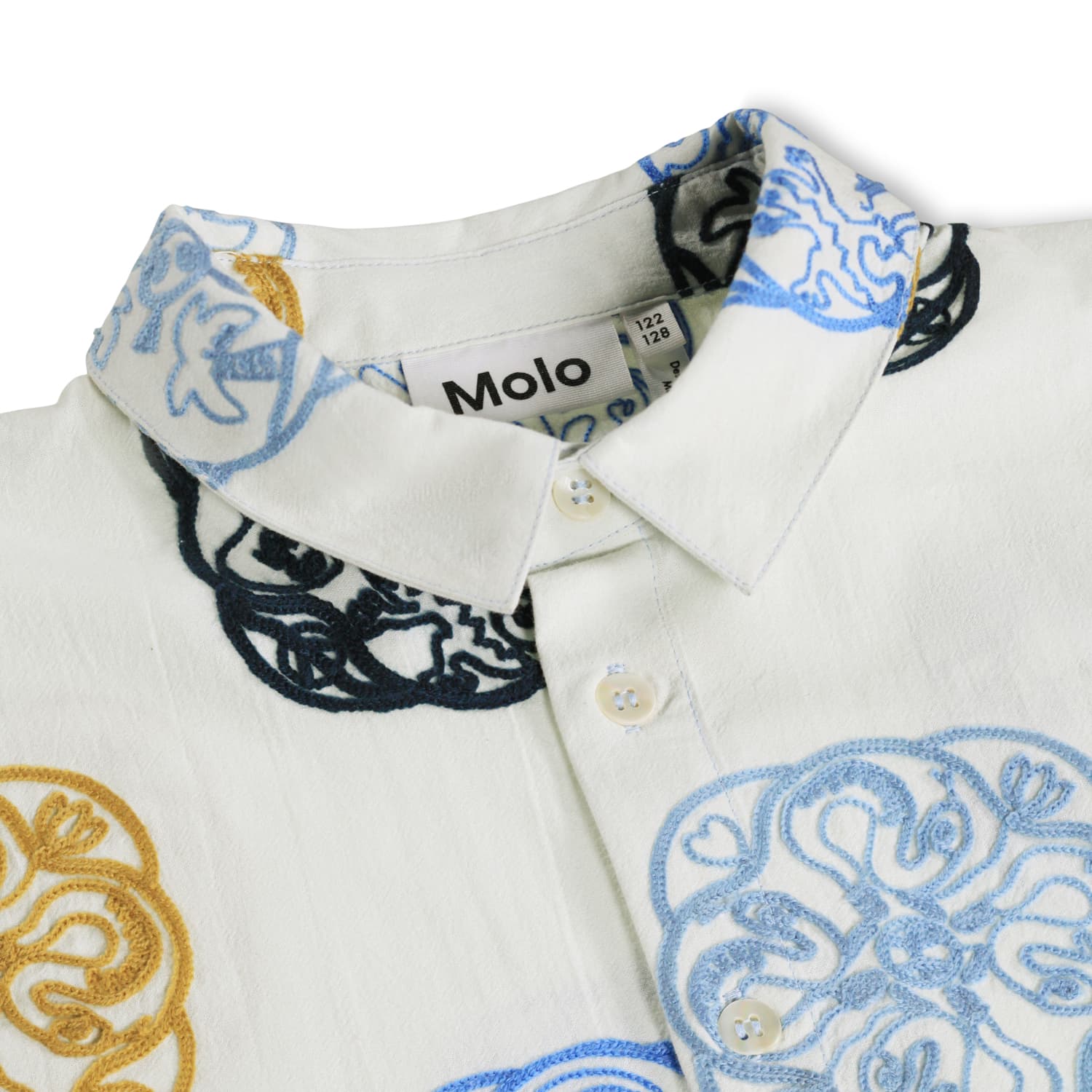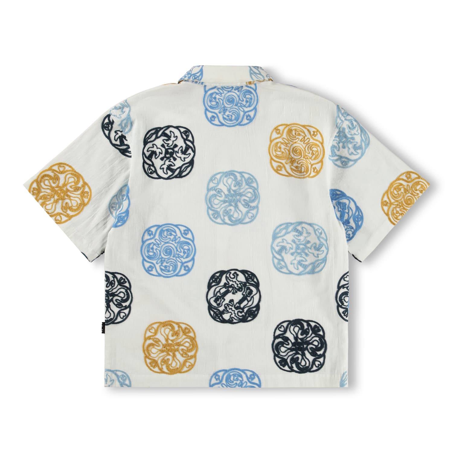 Camasa alba produsa din bumbac moale, organic cu maneci scurte largi, guler clasic si nasturi in fata. Camasa are un fit oversized cu broderii artistice in tonuri negre, cafenii si albastru.