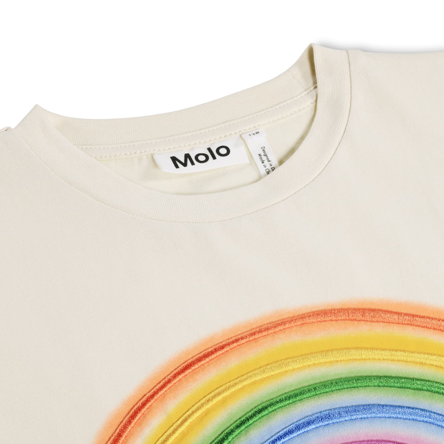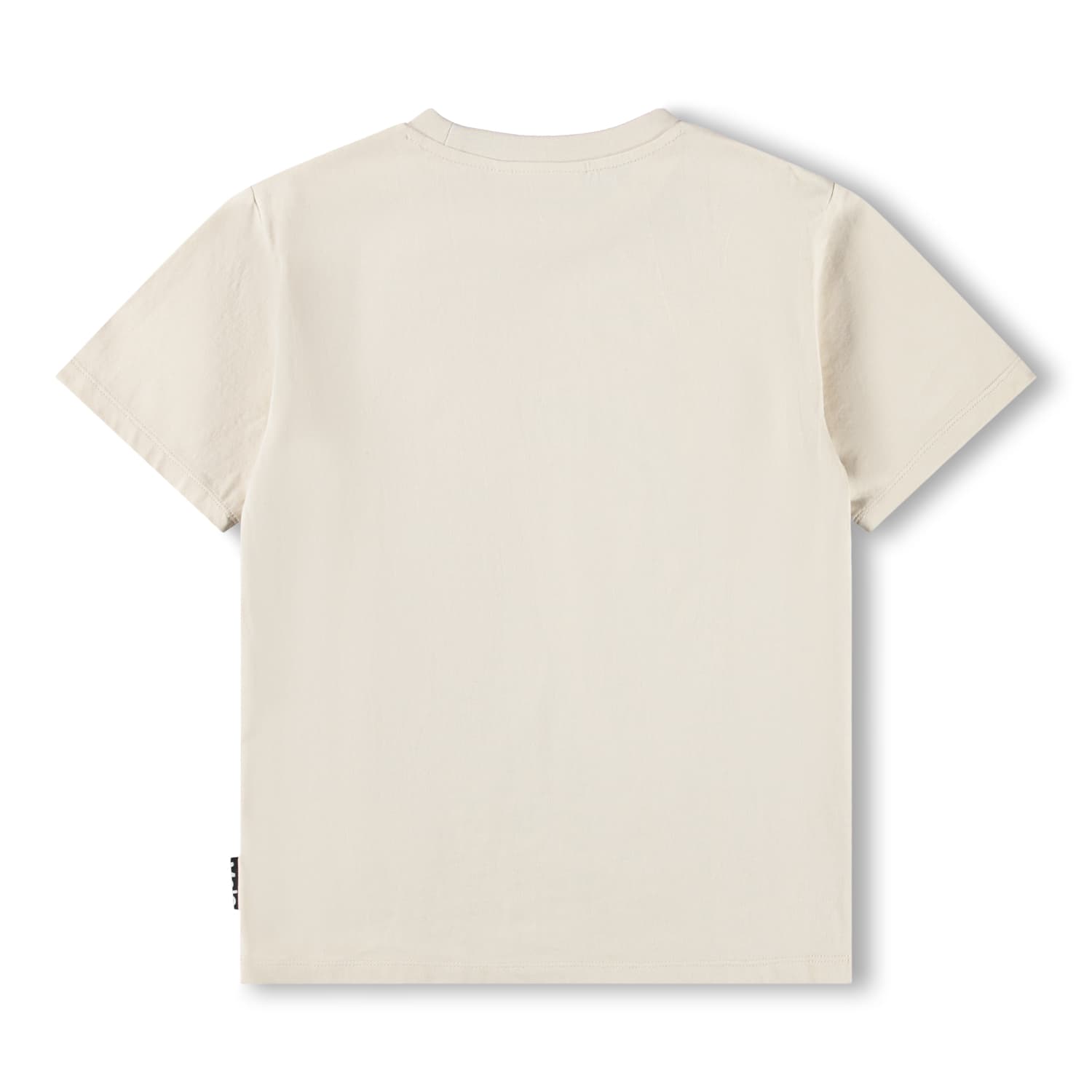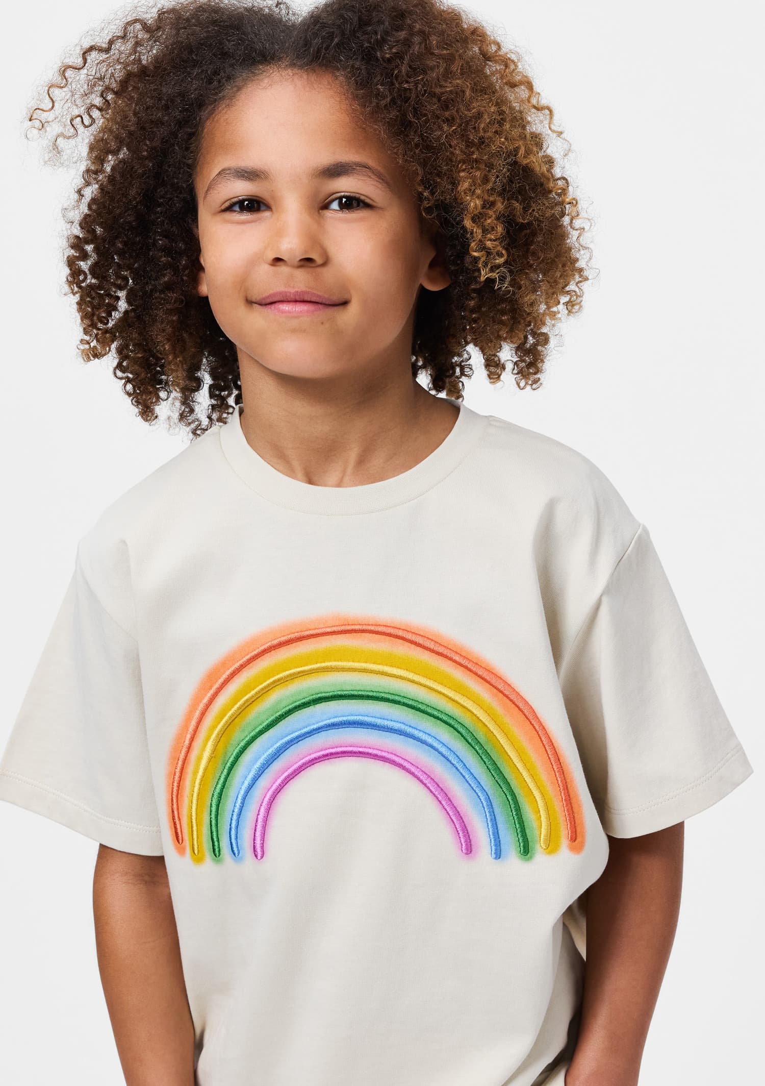 Maiou bej din bumbac moale , organic cu maneci scurte. Maioul are un fit larg cu un curcubei colorat brodat pe piept.