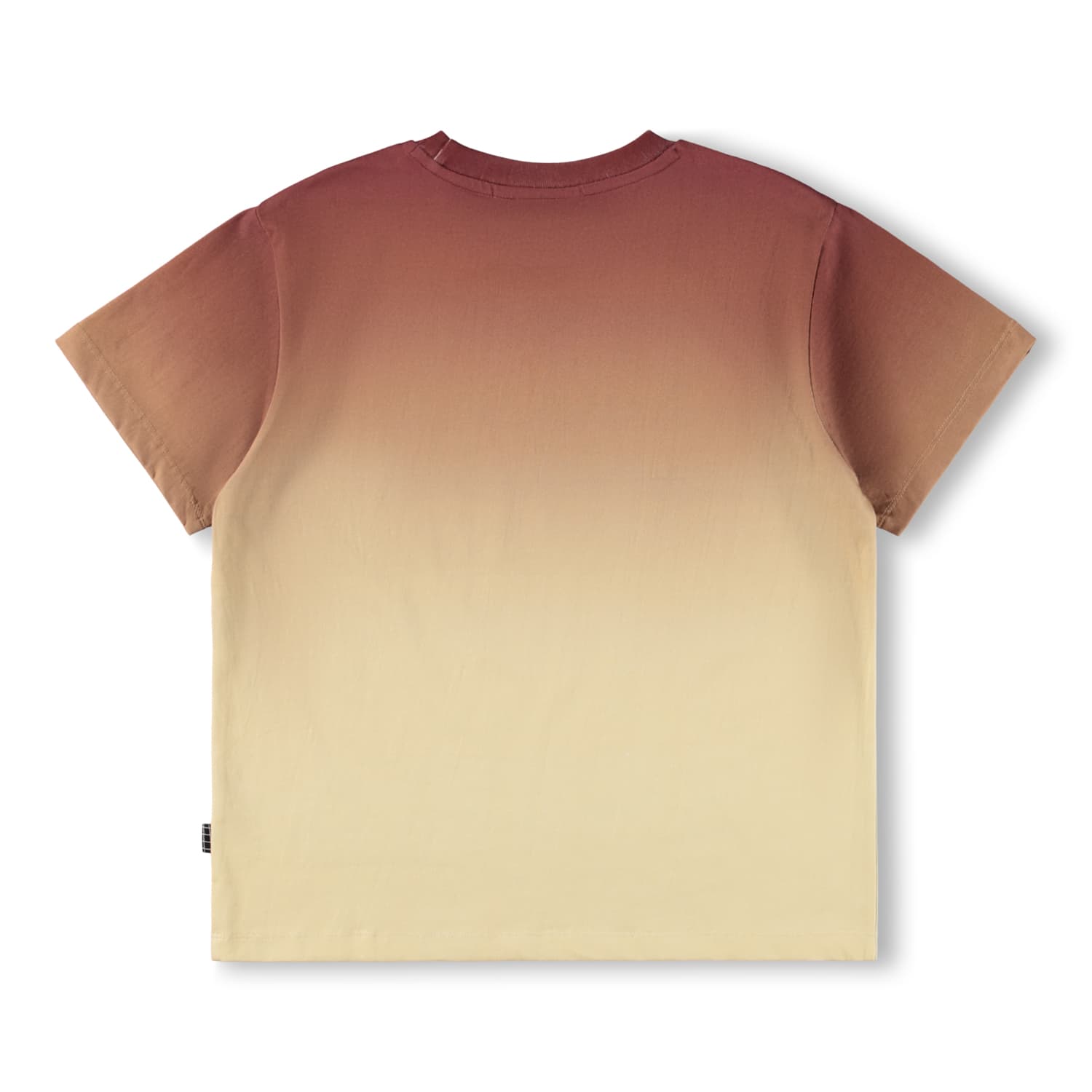 Maiou cafeniu aprins si bej produs din bumbac organic cu maneci scurte. Maioul are un fit larg cu un print mic neon pe piept.