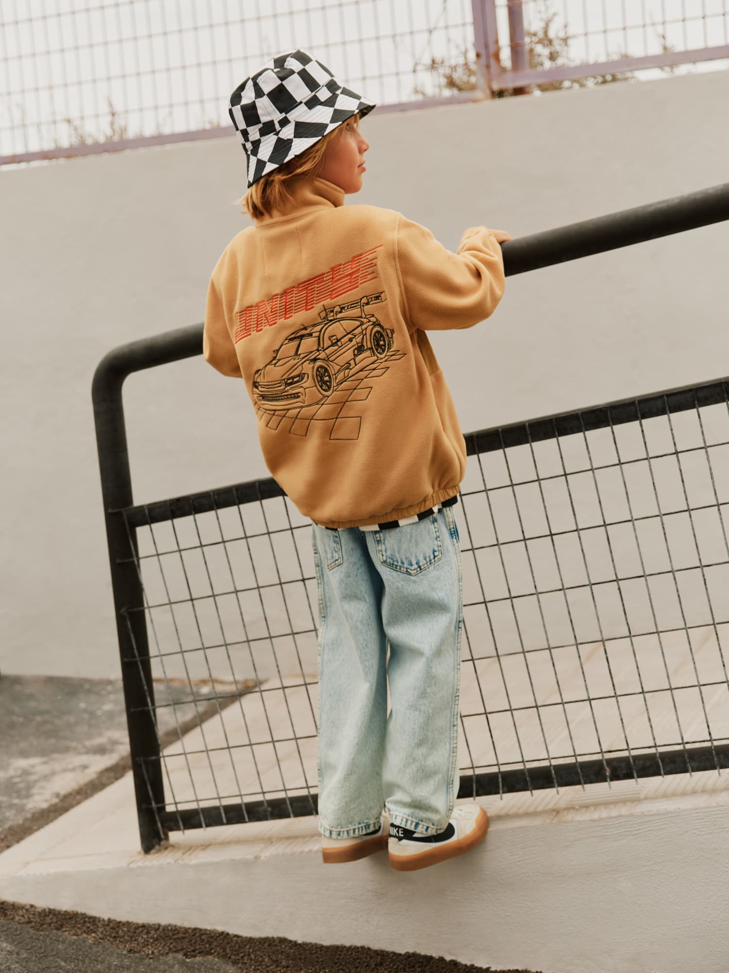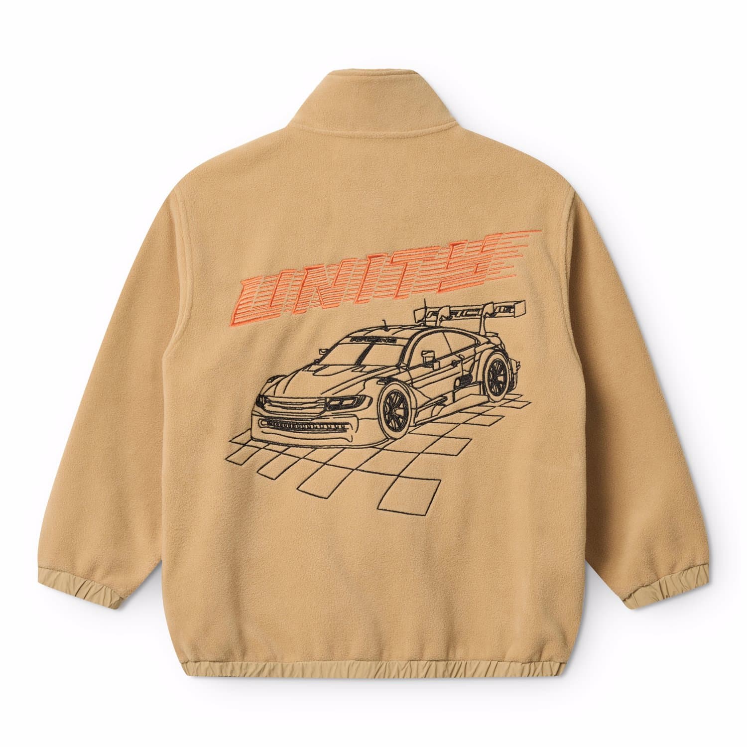 Scurta din fleece culoarea nisipului cu baza moale si tesut anti-vinbt si anti-ploaie deasupra. Scurta are fermoar cu detalii negre, guler inalt, elastic la maneci si talie,si buzunare in parti.